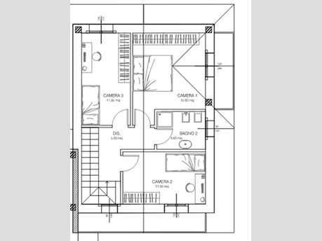 Al piano primo, con travi a vista bianche, troviamo la camera matrimoniale con balcone, due camerette da 11 mq ciascuna e bagno finestrato con piatto doccia.