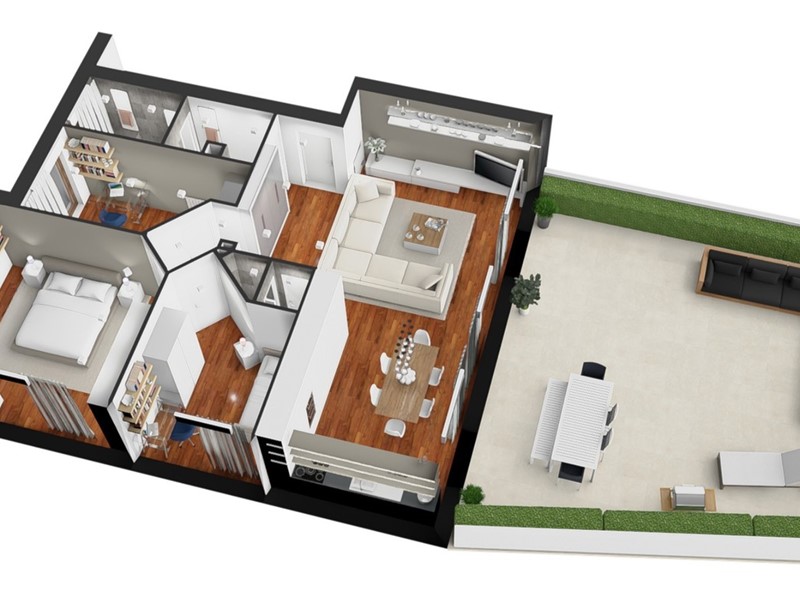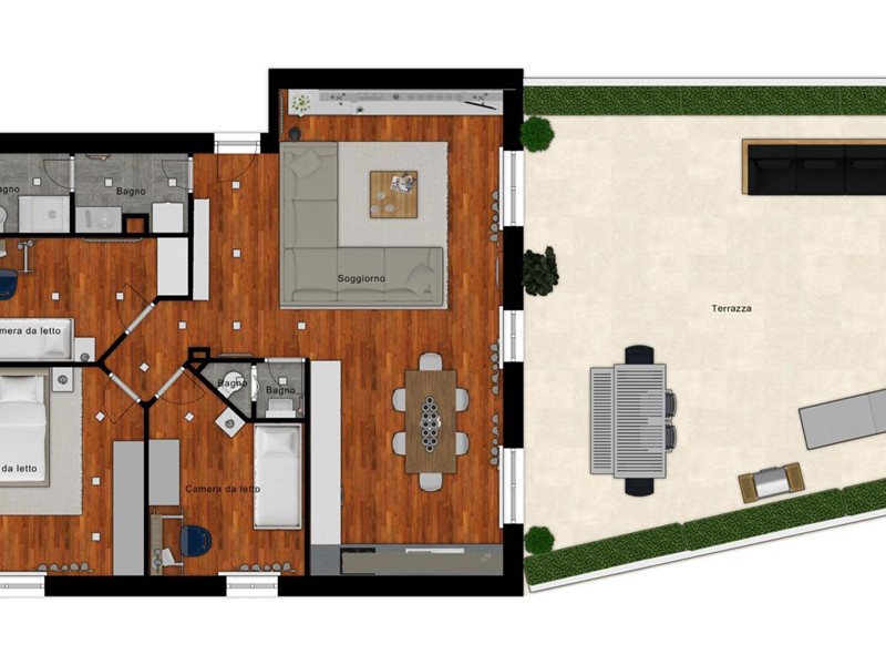 La zona notte è composta da tre camere da letto, tutte caratterizzate da una buona metratura di cui due con affaccio sull'ampio terrazzo nel mezzo delle quali c'è il bagno.