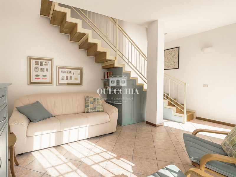 Al piano superiore si sviluppa la zona giorno, con un soggiorno luminoso, cucina separata, bagno finestrato e camera matrimoniale.