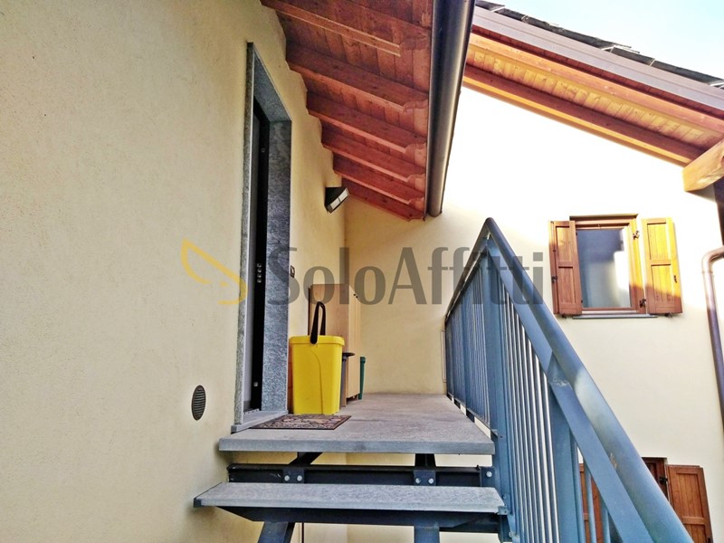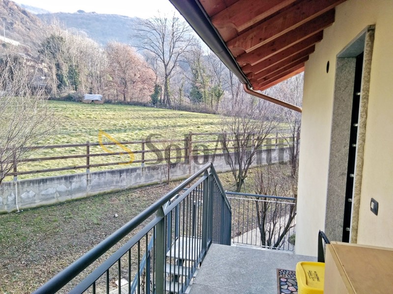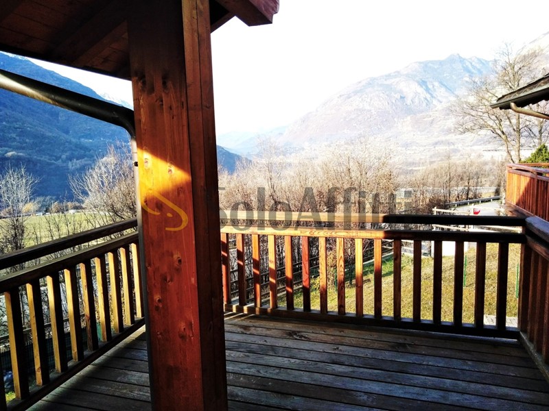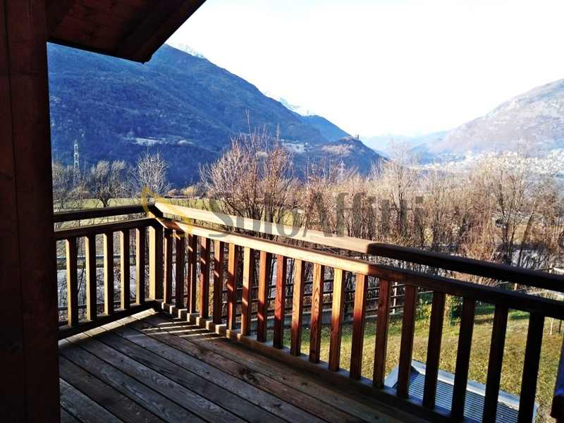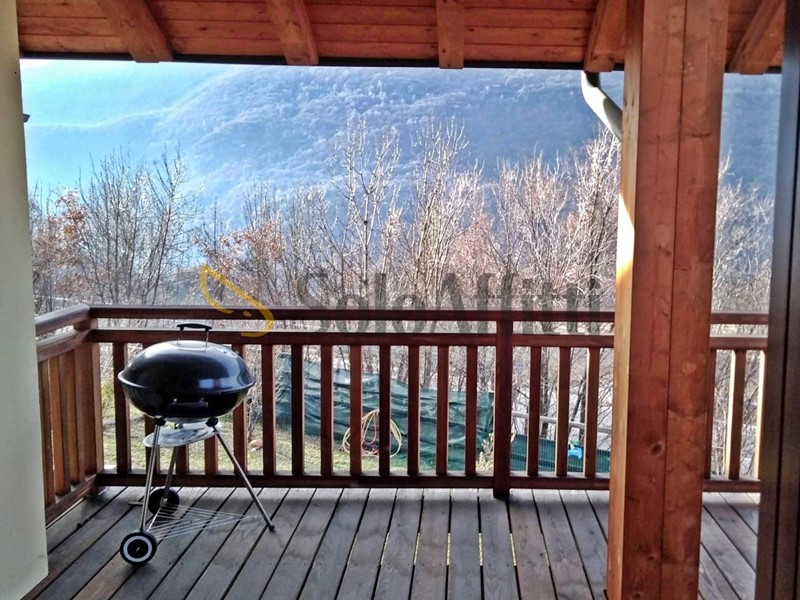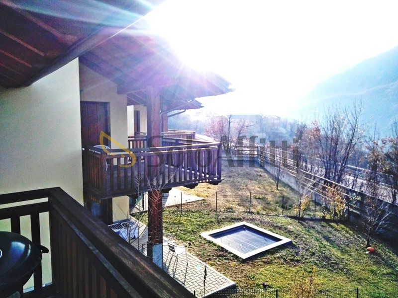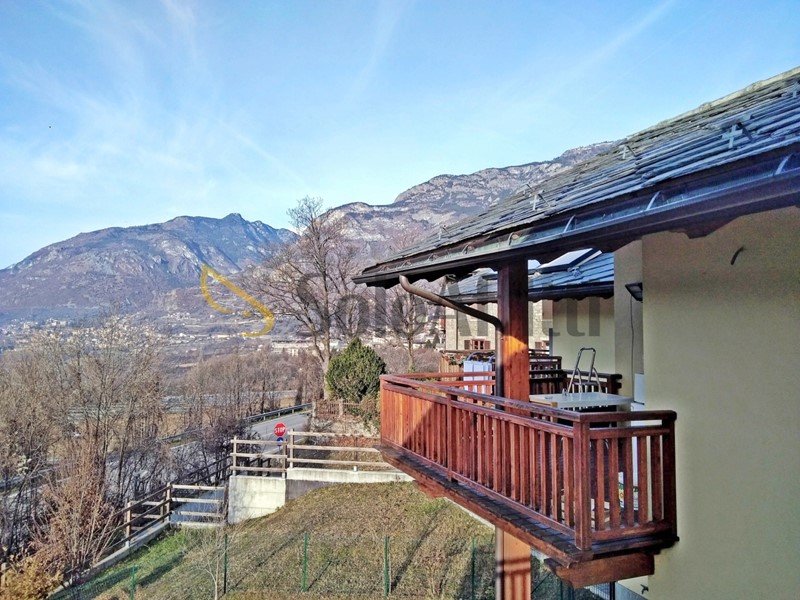 La casa si trova in via Ponte Romano, ad 1,2 Km dal centro storico e a 3 km dall'ingresso autostradale, e fa parte di un contesto di fabbricati a schiera disposti su due piani, tutti con ingresso indipendente, box auto, cantina e parcheggio non riservato. Il complesso si trova in zona residenziale e panoramica dove si può godere della vista delle montagne. L'appartamento è situato al primo piano, al quale si accede da scala esterna e si sviluppa su due livelli; al primo livello soggiorno con cucina a vista , camera matrimoniale, disimpegno e servizio con doccia. Gli infissi sono in legno con doppi vetri, i pavimenti in gres porcellanato effetto rovere sbiancato, le porte interne in rovere con listini di metallo, i soffitti con travi in legno a vista. La sensazione di vivere in uno chalet è data anche dalla terrazza abitabile e soleggiata, interamente in legno, sia la ringhiera, sia la pavimentazione e il sottotetto. Le dimensioni della terrazza permettono la possibilità di godere di uno spazio esterno riservato, lontano dalla confusione e sfruttabile tutto l'anno. Box auto eventualmente soppalcabile, grazie alla generosa altezza, collegato direttamente con la cantina. Alla zona box si accede da rampa e cancello automatico, o in alternativa da scala con ingresso diretto dal locale cantina. Il riscaldamento è con caldaia centralizzata, così come il riscaldamento dell'acqua sanitaria. L'alloggio è dotato di cucina in linea con piastre ad induzione . Le spese condominiali, di riscaldamento, acqua fredda e caldaia ammontano ad euro 100,00 mensili salvo conguaglio.