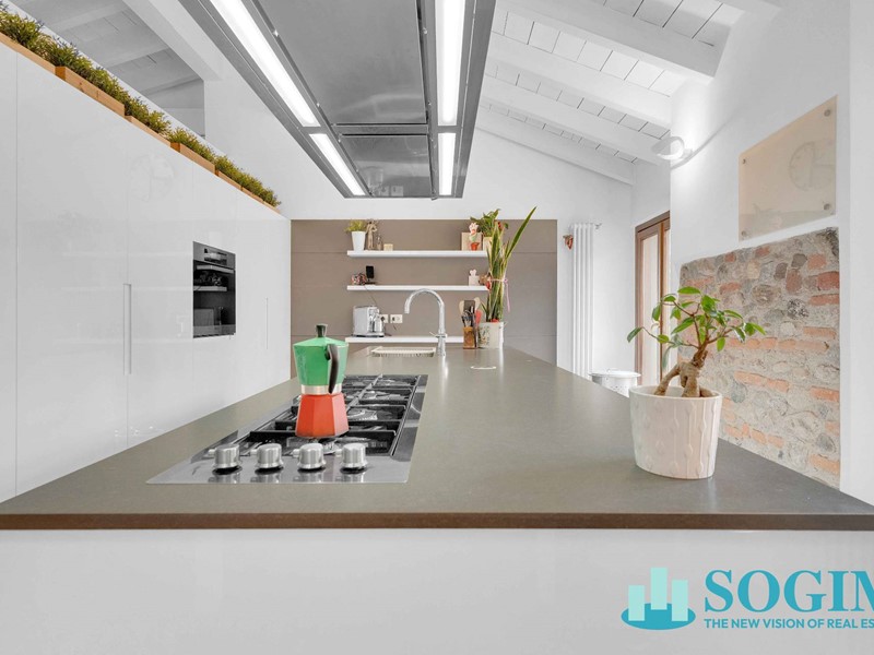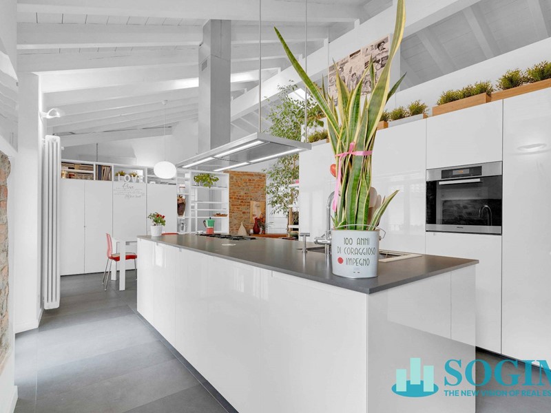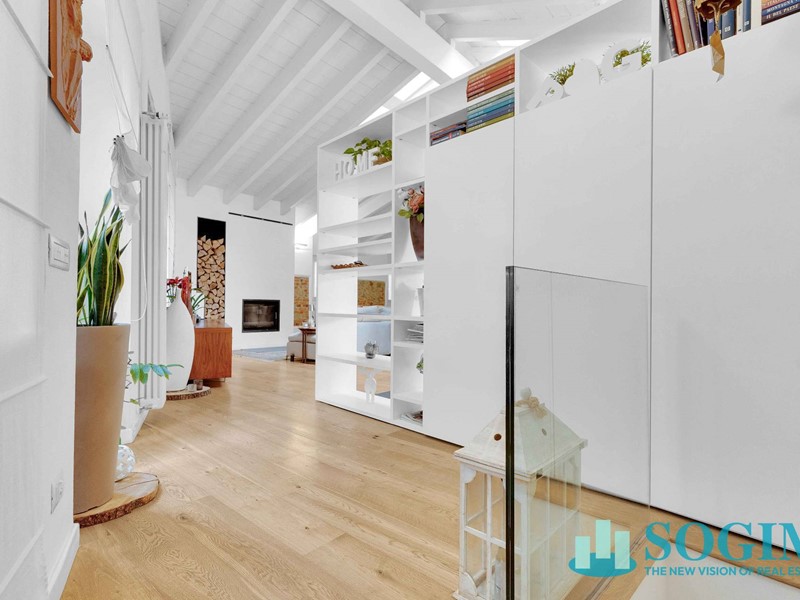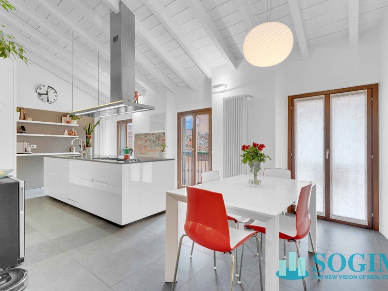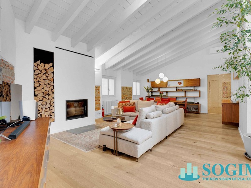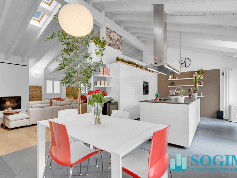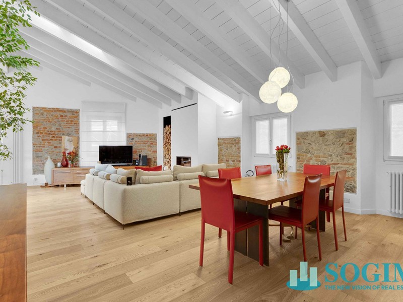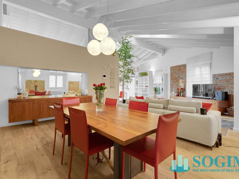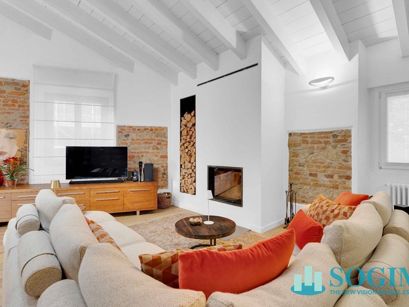 Lappartamento è composto da un ampio open space che include soggiorno e cucina abitabile. Le generose metrature consentono di avere la zona pranzo e la zona relax ben separate, garantendo massima privacy, sia per godere dellarea conversazione/TV davanti al tepore del camino a legna, sia per organizzare grandi tavolate con gli ospiti più graditi. Le numerose vetrate, il soffitto in legno sbiancato e i velux risaltano la naturale luminosità di tutti gli ambienti. Il velux del soggiorno inoltre regala unincantevole vista sullo storico campanile della Basilica Romana di San Paolo.