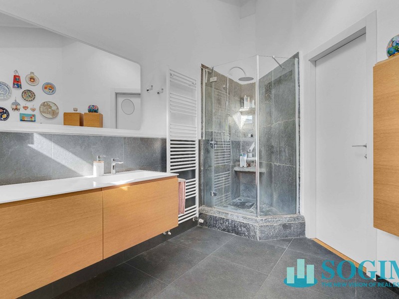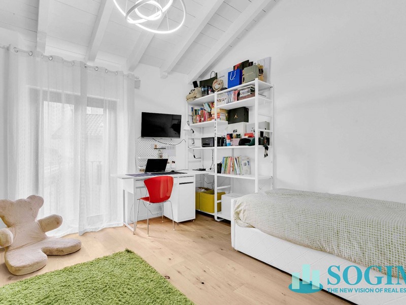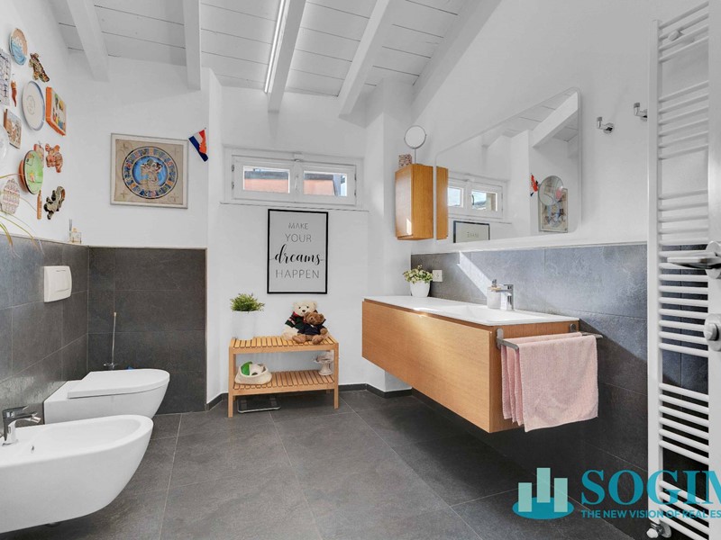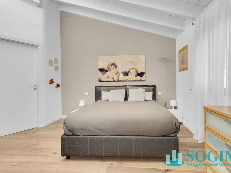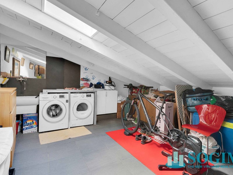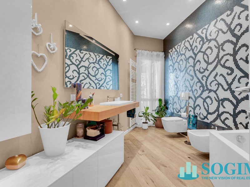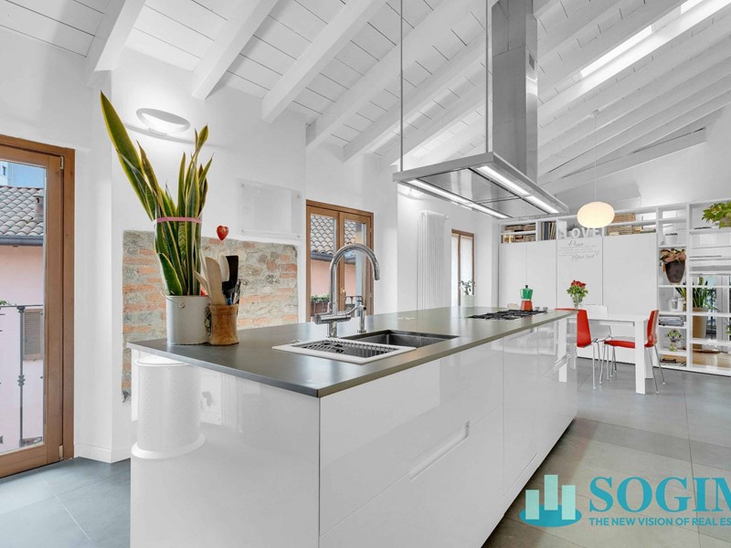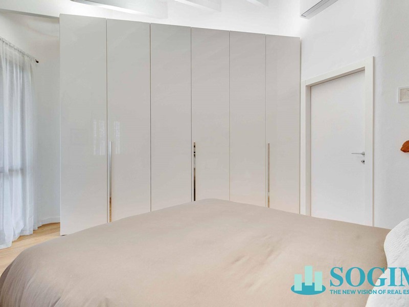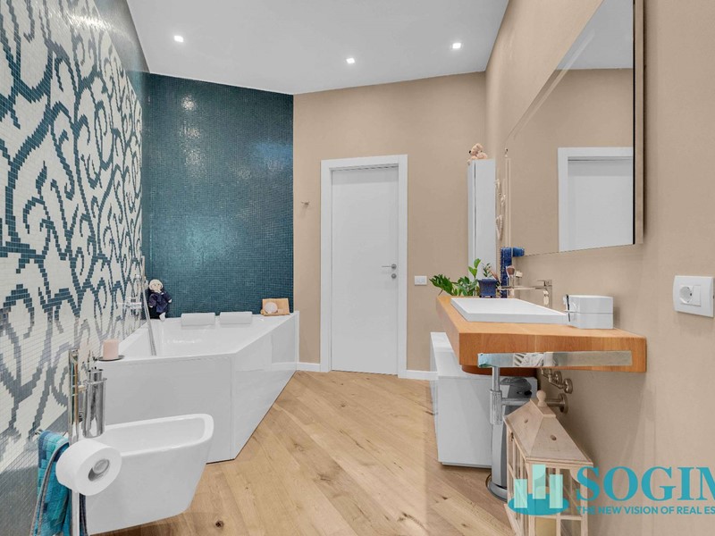 Lappartamento è composto da un ampio open space che include soggiorno e cucina abitabile. Le generose metrature consentono di avere la zona pranzo e la zona relax ben separate, garantendo massima privacy, sia per godere dellarea conversazione/TV davanti al tepore del camino a legna, sia per organizzare grandi tavolate con gli ospiti più graditi. Le numerose vetrate, il soffitto in legno sbiancato e i velux risaltano la naturale luminosità di tutti gli ambienti. Il velux del soggiorno inoltre regala unincantevole vista sullo storico campanile della Basilica Romana di San Paolo.