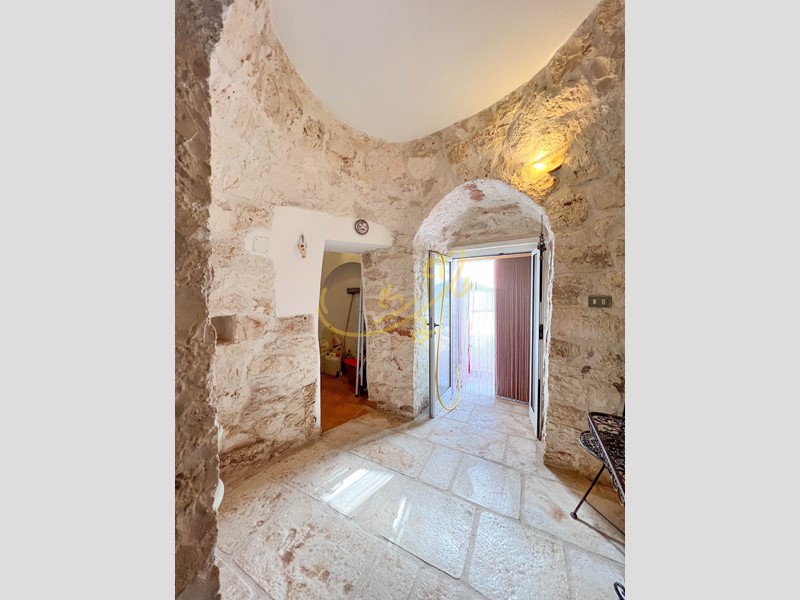 Tramite un cancello si accede al piazzale con vista panoramica sulla valle, la zona esterna è attrezzata con grande forno a legna e barbecue. Tramite l'ingresso principale si accede alla lamia, con piccolo soggiorno con camino e angolo cucina, una piccola camera da letto e bagno con doccia, il trullo molto ampio, con pavimento in chianca originale, accoglie la camera matrimoniale e un disimpegno che lo collega alla lamia. La casa si trova vicino ad altre abitazioni, ottimo investimento per villeggiatura estiva.