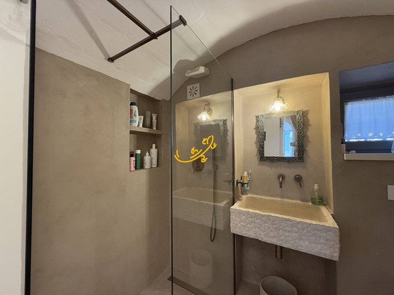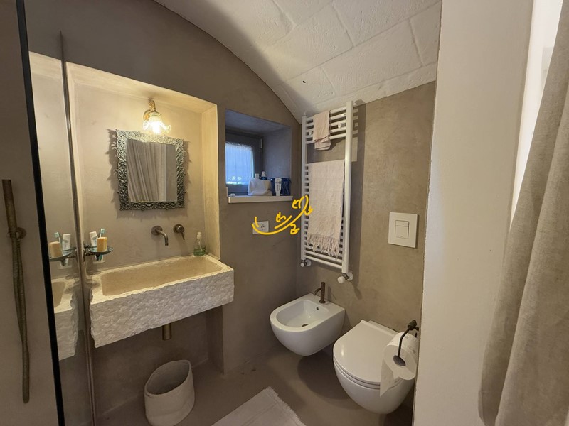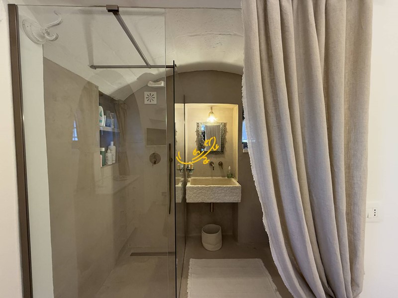 Le finiture sono di ottima qualità, con pavimentazione interna in resina corpi illuminanti integrati nella muratura, arredamento curato nei particolari e splendidi lampadari ed applique con motivi floreali; impianto di riscaldamento a pavimento e pareti interne caratterizzate da tipiche nicchie di varie dimensioni. L'area esterna, di circa 6.500 mq è caratterizzata da terrazzamenti con piante di ulivo, mandorlo, alberi da frutto e macchia mediterranea, e bellissime rocce affioranti, da cui si può ammirare il mare.