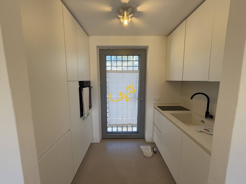 L'immobile di circa 100 mq presenta un'accogliente zona living, una cucina ben attrezzata, due camere da letto matrimoniali, ognuna con bagno privato con doccia e lavandini in pietra naturale, ed un terzo bagno a servizio della zona living. Un'elegante alcova ospita un letto da una piazza e mezza ed un ulteriore divano che all'occorrenza diventa letto singolo.