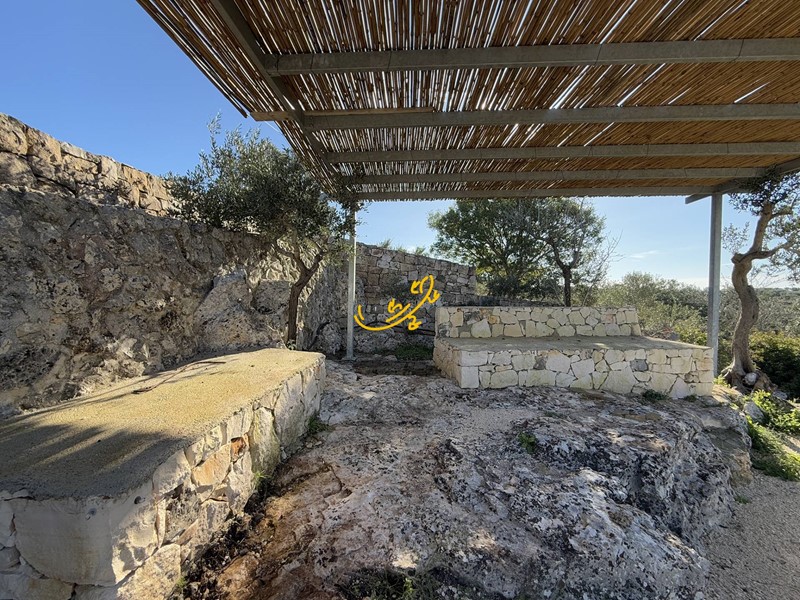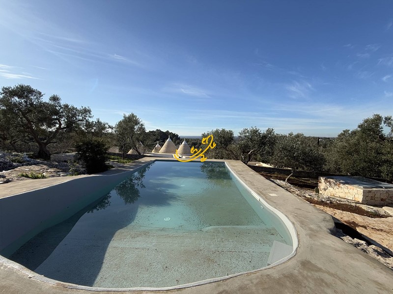 Intorno alla struttura del trullo fa da contorno un'ampia zona pavimentata in chianche, con cucina esterna, grande lavandino, forno a legna in pietra a secco, barbecue in muratura ed un enorme tavolo da pranzo composto da un blocco unico in pietra ideale per pranzi/cene all'aperto. Delimitano la zona esterna varie sedie in muratura ed una zona salotto composta da divani in pietra a secco. La piscina è di 40 mq. con ingresso in roccia e vista panoramica sia su tutta la Valle d'Itria, da cui è possibile ammirare i paesaggi di Cisternino, Locorotondo e Martina Franca, sia verso il mare da cui si ammira tutto l'Adriatico. Intorno alla piscina con doccia esterna calda sono posizionati letti matrimoniali prendisole, una zona living con pergola coperta da arelle con divani in muratura da cui si domina l'intero panorama. Completa l'offerta un pozzo artesiano privato.