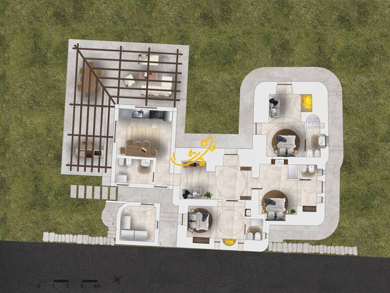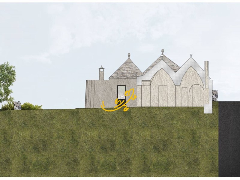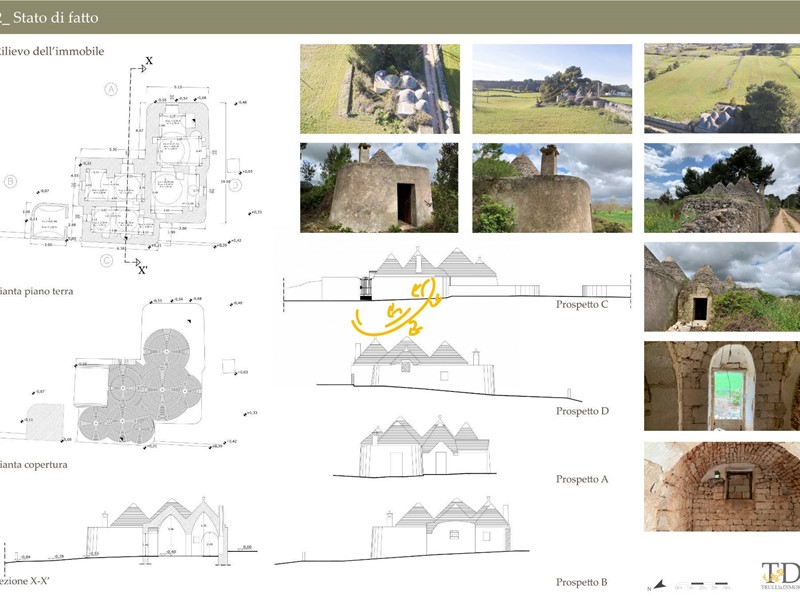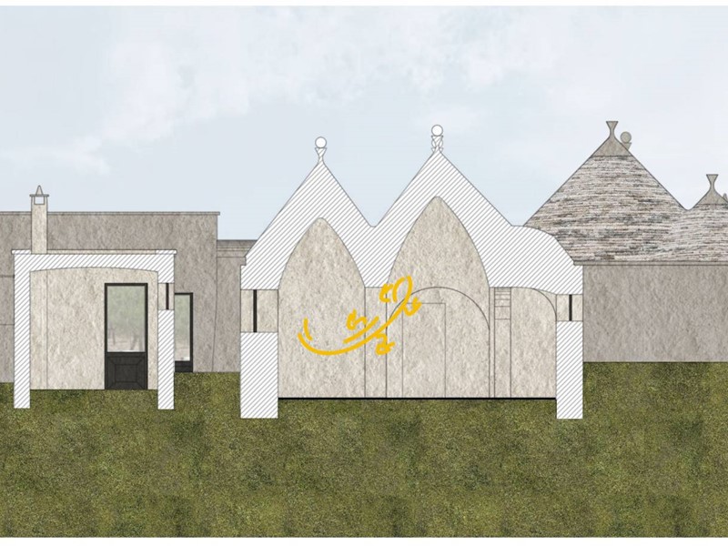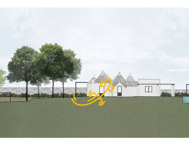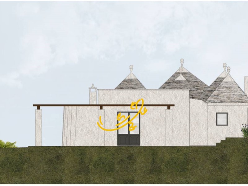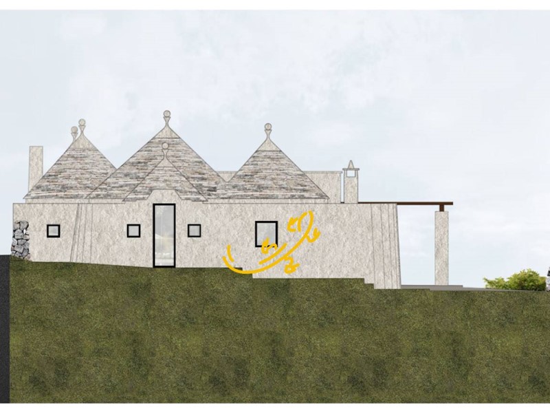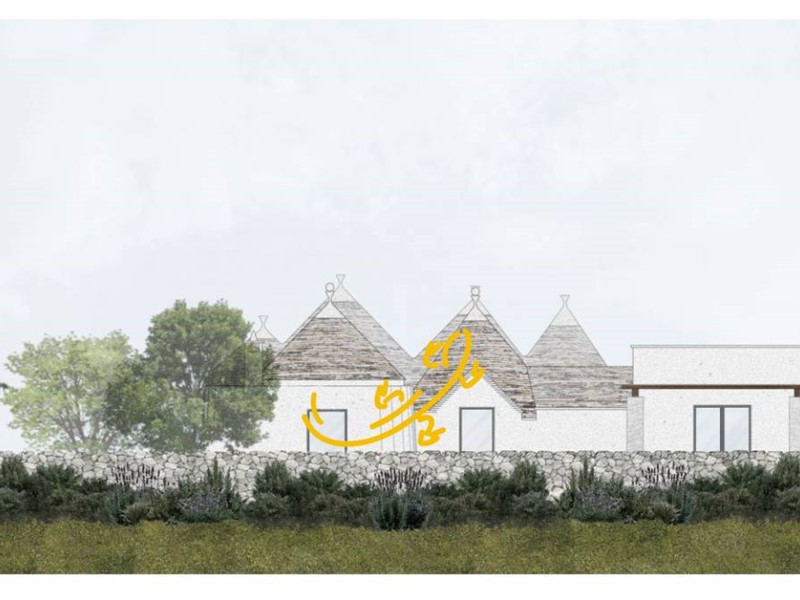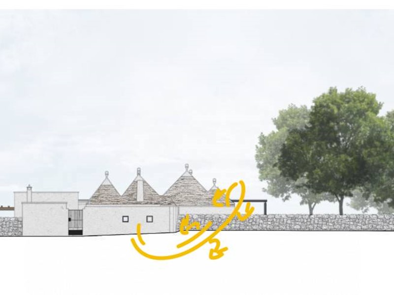 -Ristrutturazione dei Trulli Esistenti: Il progetto prevede il restauro dei trulli esistenti nella Valle d'Itria, con attenzione al rispetto dei materiali e delle tecniche tradizionali. Saranno riparate le parti danneggiate e consolidate quelle fragili, mantenendo l'identità rurale della struttura. Alcune pareti saranno modificate per creare tre camere da letto con bagni privati e altre aree funzionali come soggiorni e una lavanderia esterna.