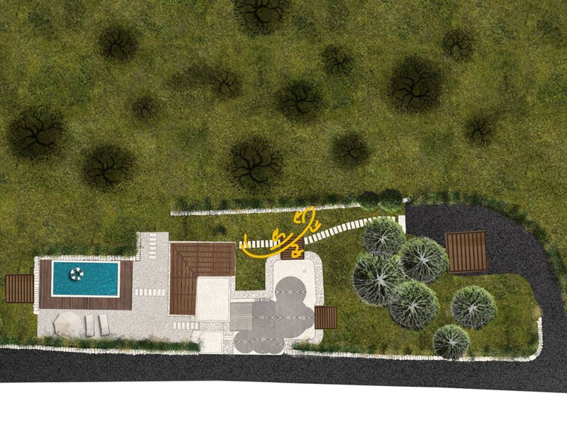 -Ampliamento e Comfort: Verrà aggiunta una cucina luminosa che si affaccia sul paesaggio circostante, con un'ampia area esterna protetta da un pergolato in legno. Questo spazio all'aperto includerà una cucina esterna, un grande tavolo per i pasti all'aperto e una zona relax. Sarà data particolare attenzione al progetto del verde, con la conservazione degli alberi esistenti e la creazione di un giardino mediterraneo accanto alla piscina a sfioro.