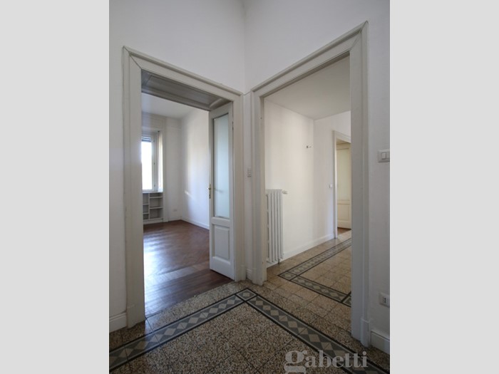 L'appartamento conserva la pavimentazione originale dell'epoca, marmette nella zona giorno e parquet a lisca di pesce nelle camere e nel soggiorno.
