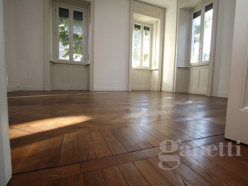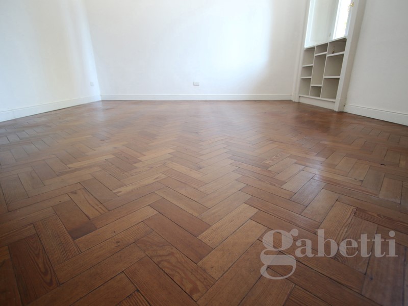 L'appartamento conserva la pavimentazione originale dell'epoca, marmette nella zona giorno e parquet a lisca di pesce nelle camere e nel soggiorno.