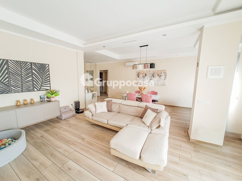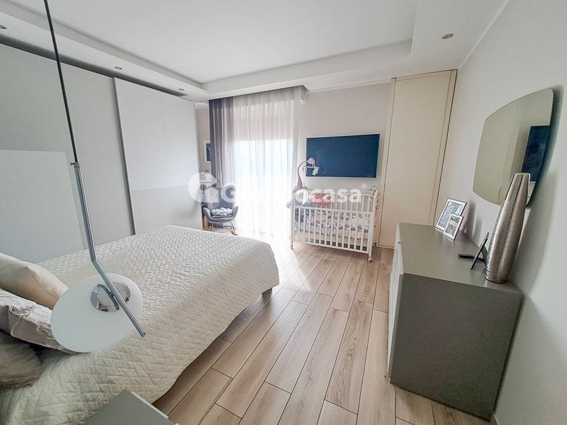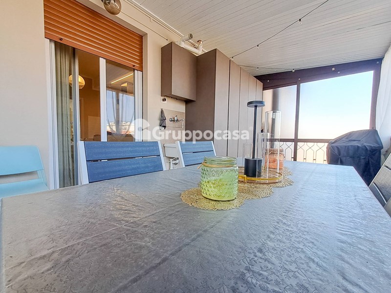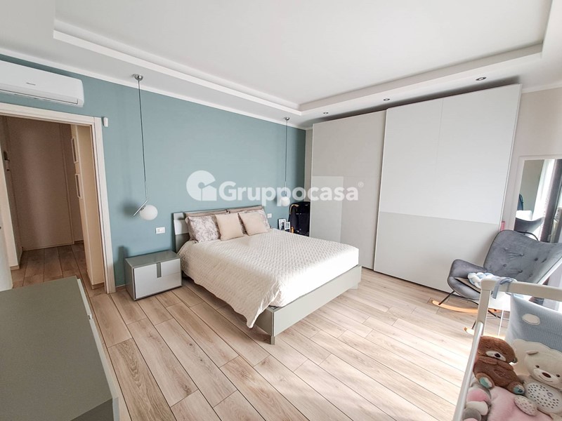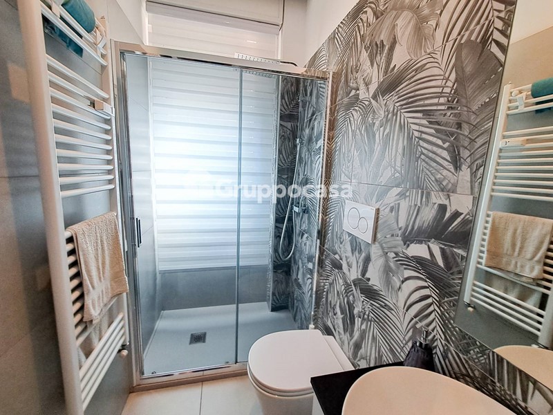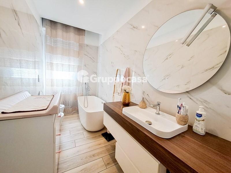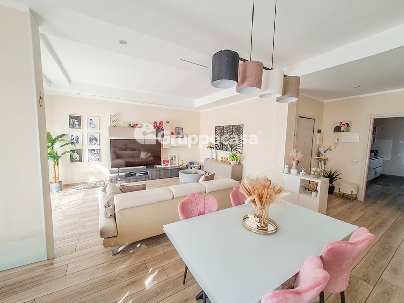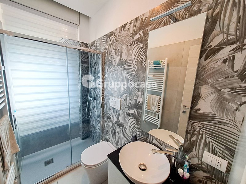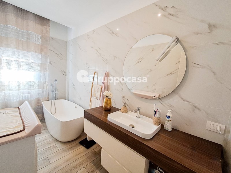 Il trilocale è composto da ingresso, salone, cucina abitabile, due camere da letto, doppi servizi, terrazzo di circa 30 mq e balcone. Completano la soluzione la cantina e il box auto posti entrambi al piano seminterrato.