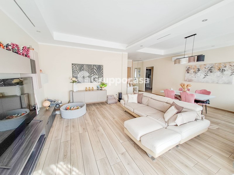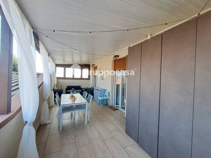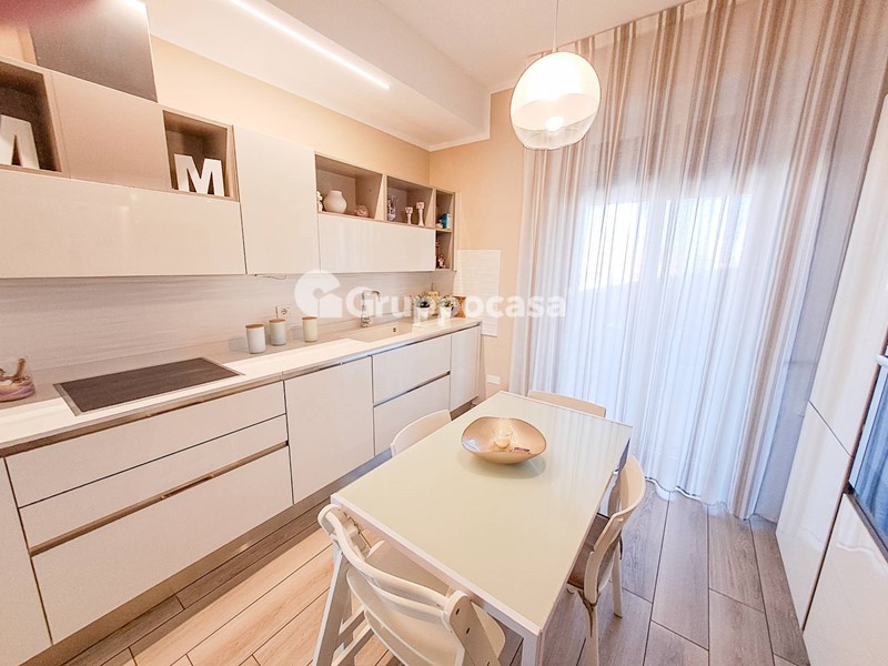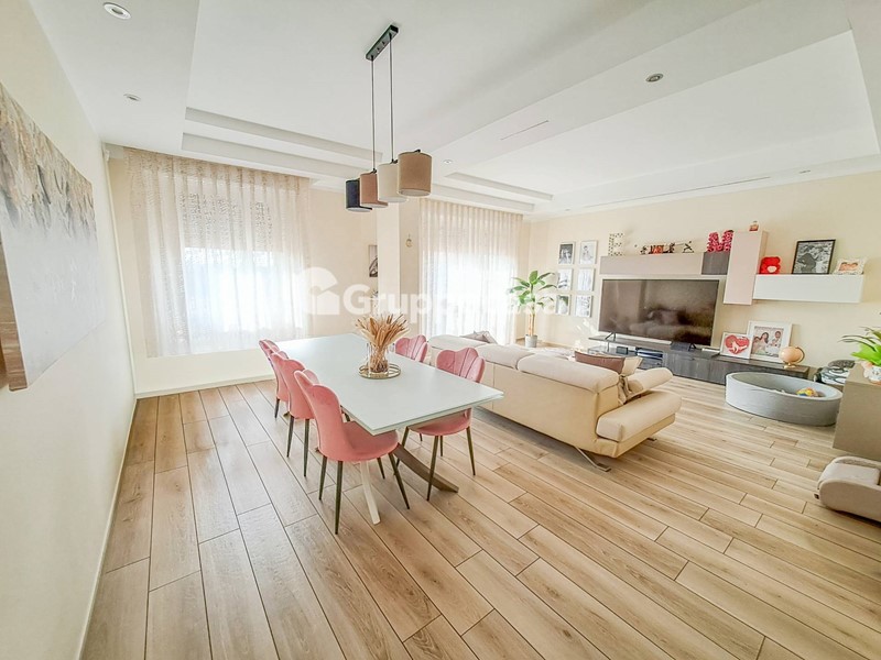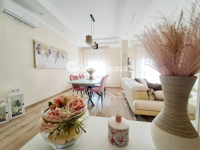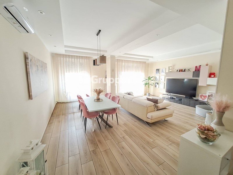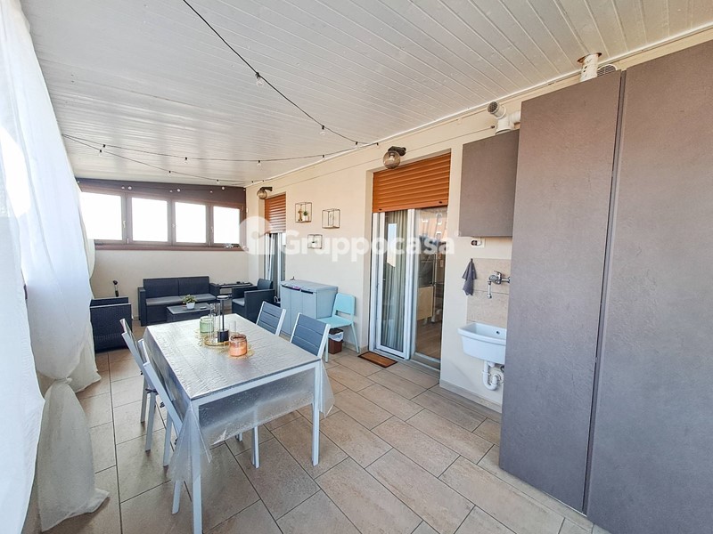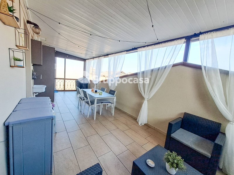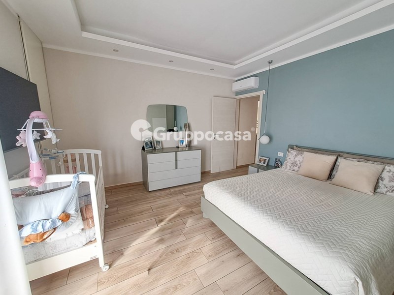 Il trilocale è composto da ingresso, salone, cucina abitabile, due camere da letto, doppi servizi, terrazzo di circa 30 mq e balcone. Completano la soluzione la cantina e il box auto posti entrambi al piano seminterrato.