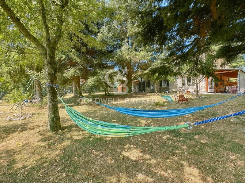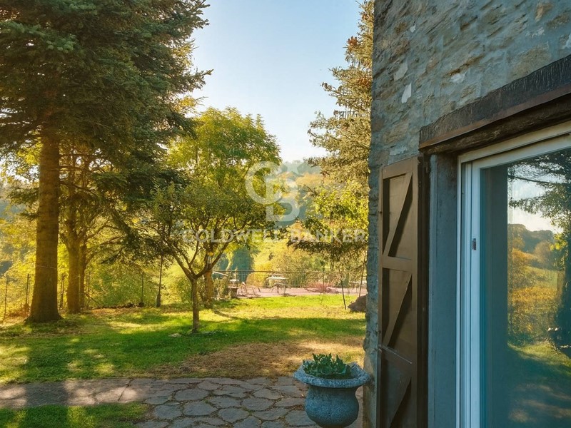Spazi Esterni: Il giardino privato, circondato da alberi e vegetazione, offre ampi spazi per vivere all'aperto. Pavimentato in pietra, l'esterno è arredato con tavoli e sedie, perfetto per cene sotto le stelle o momenti di relax.
