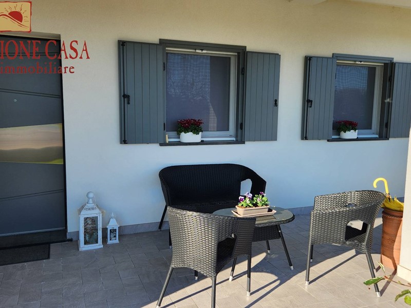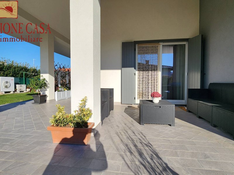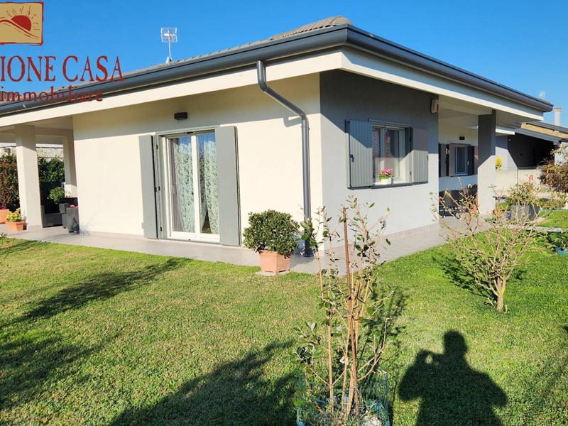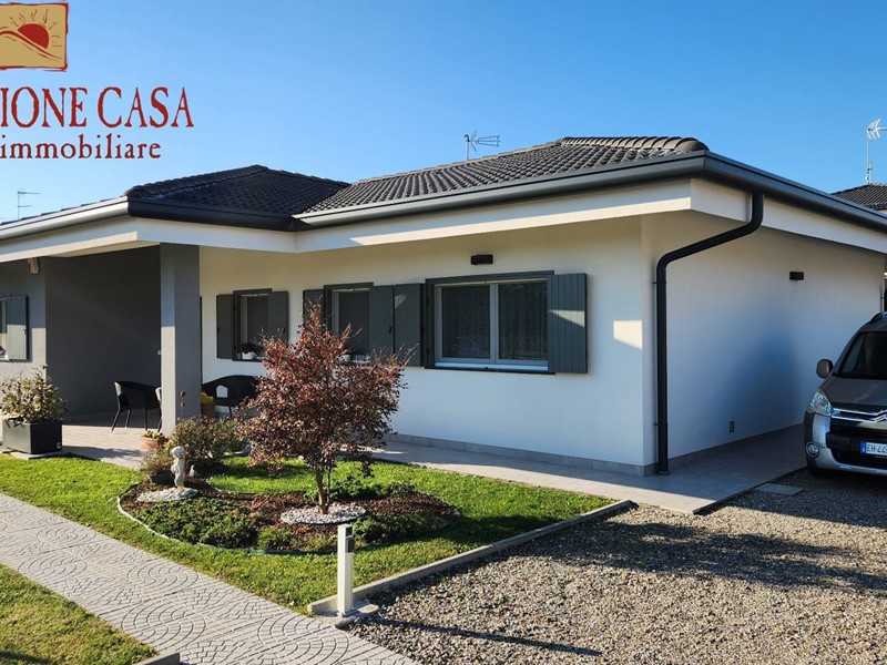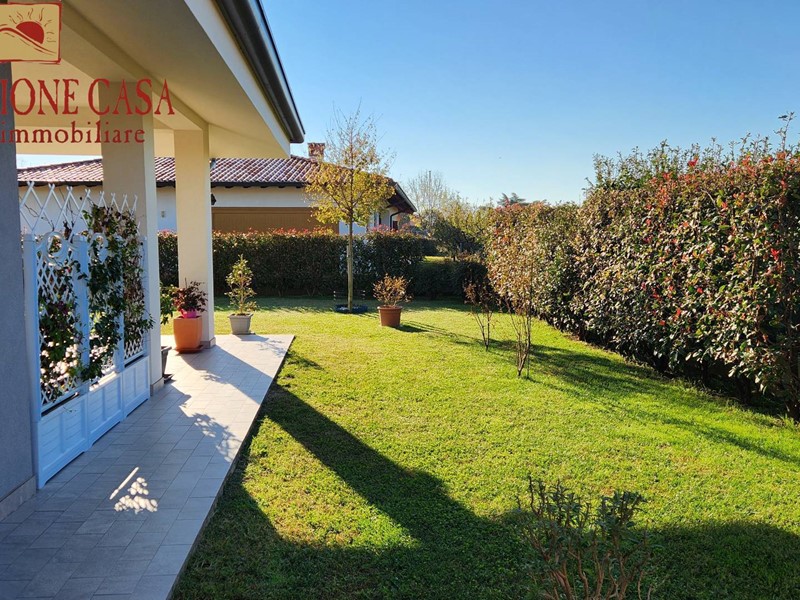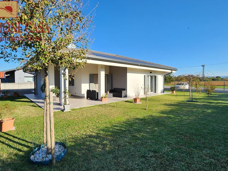 Romans d'Isonzo: in meravigliosa zona residenziale a due passi dalle scuole....recentissima villa singola del 2019 costruita in bioedilizia composta da ingresso, salone, ampia cucina abitabile con uscita sul porticato, disimpegno, 2 grandi matrimoniali, doppi servizi (entrambi finestrati), cantina, lavanderia con doccia, doppio portico di mq.23,44 e mq.9.33, sottotetto uso deposito, doppio posto auto scoperto. Possibilità di recuperare la 3°camera e doppio posto auto coperto in edilizia libera. Riscaldamento a pavimento bizona con pompa di calore, impianto fotovoltaico da 4,5 Kwh con inverter (già predisposto per batterie), doppio clima Sansung da 12.000 btu ciascuno, casetta in legno esterna. Giardino piantumato di circa mq.600. Classe energetica A4. L'immobile verrà lasciato libero fine 2026: 367.000 (rif.1627)