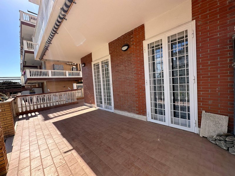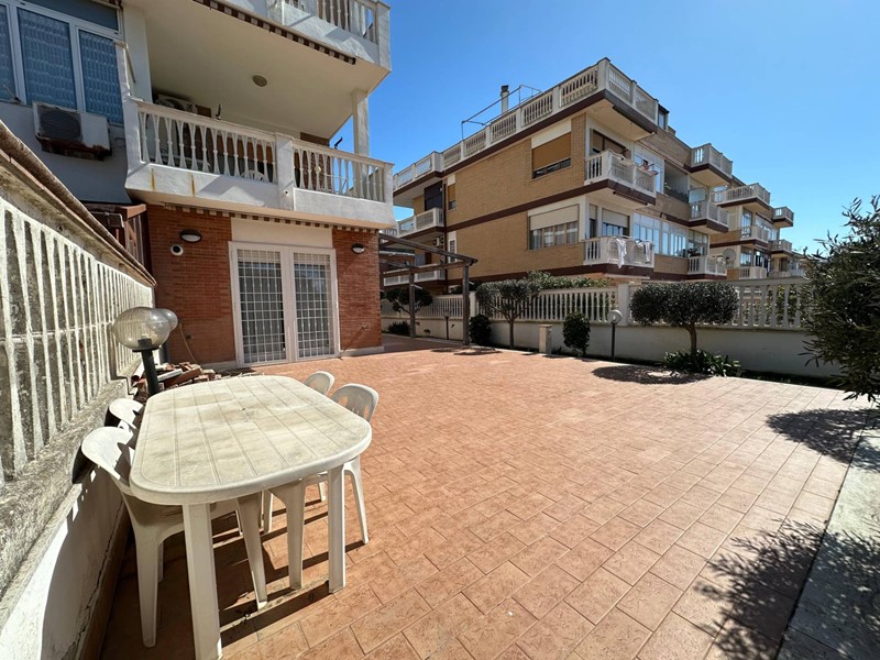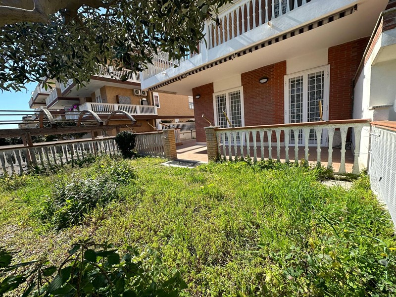 Marina di Ardea, vista mare, a 50 metri dalla spiaggia, appartamento due livelli finemente ristrutturato sito al piano terra con ingresso indipendente di una palazzina in cortina. L'immobile è così composto: ingresso, salone con angolo cottura con accesso diretto al giardino, due camere e servizio finemente ristrutturato con materiali di prima scelta. L'appartamento dispone di condizionatori, grate, finestre in alluminio scorrevoli, ampio giardino di 240 mq. con tende da sole; completa la proprietà un box auto di proprietà, cantina e posto auto.