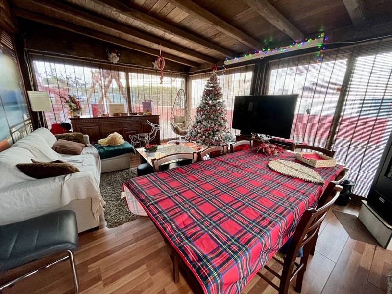 L'appartamento è internamente composto da salone con angolo cottura con accesso sul giardino privato, splendida veranda con pareti vetrate, camera matrimoniale, cameretta anch'essa con accesso al giardino esclusiva e servizio con doccia e finestra.