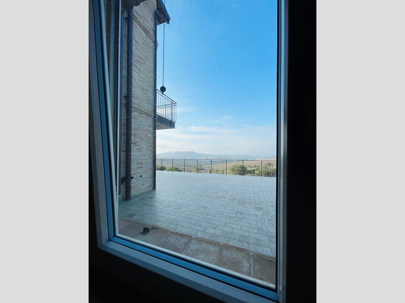 Al piano terra si sviluppa la residenza principale: un ampio soggiorno con cucina a vista che si apre su una terrazza spettacolare, dove ogni tramonto è uno spettacolo che va dal Monte San Vicino ai Monti Sibillini.