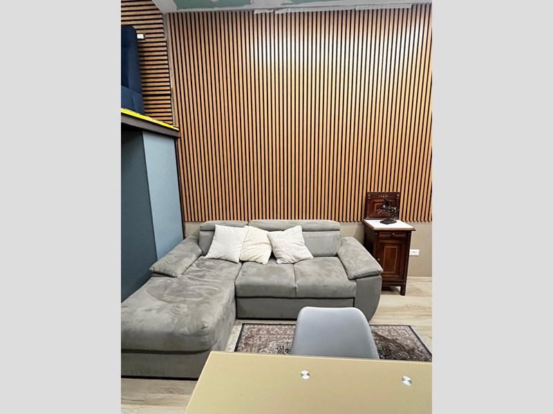 L’ambiente principale, luminoso e accogliente, ospita una zona giorno con cucina a vista di ultima generazione, totalmente domotica, e un angolo salotto con divano.