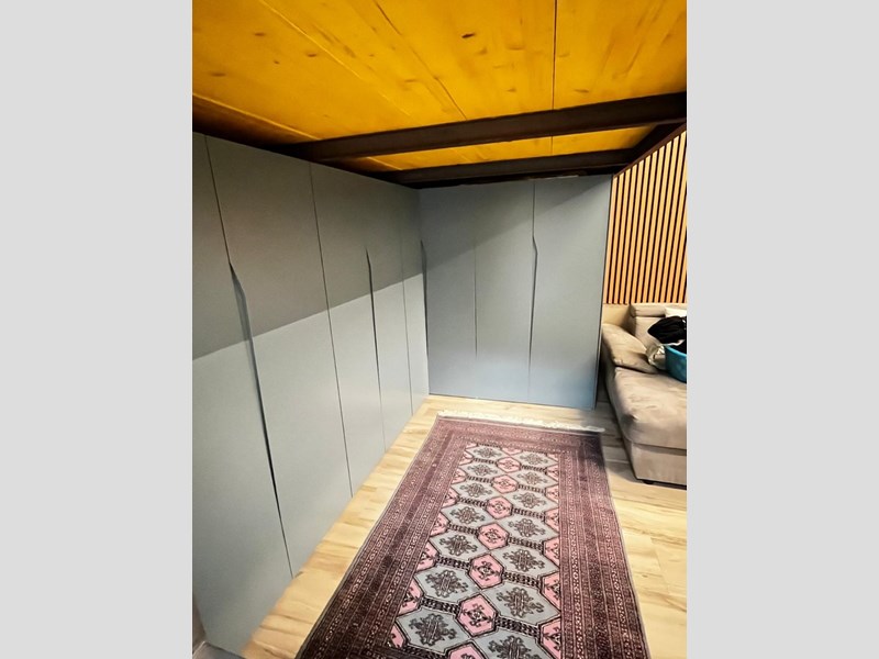 La zona notte soppalcata accoglie un letto matrimoniale, mentre sotto il soppalco trova spazio un ampio armadio su misura, per un risultato funzionale e raffinato allo stesso tempo.