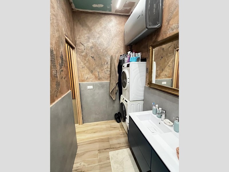 Il bagno, elegante e completo, è dotato di una grande doccia e di un pratico angolo lavanderia.