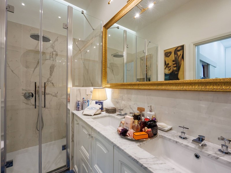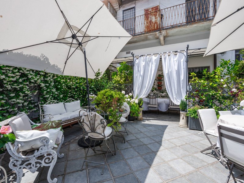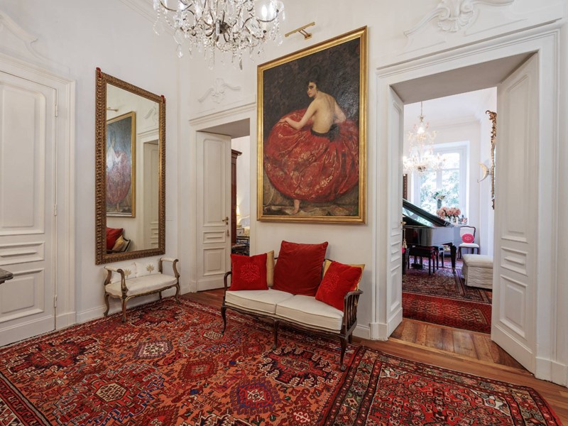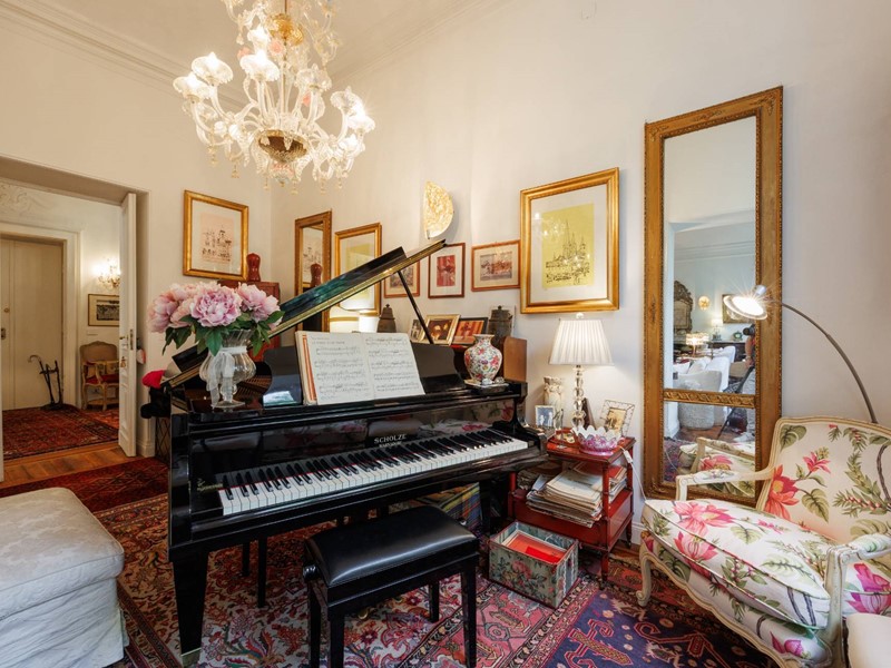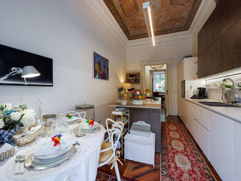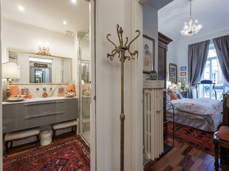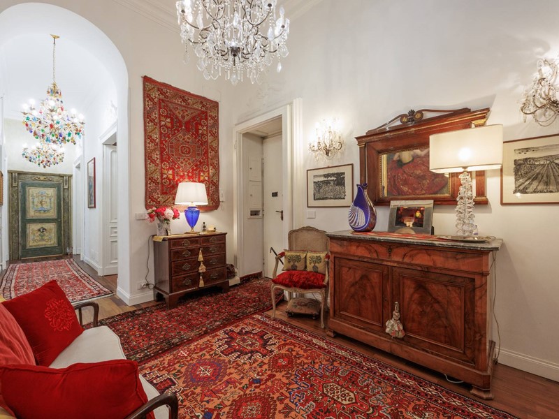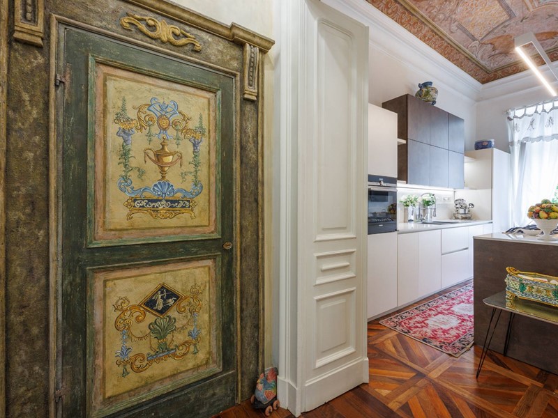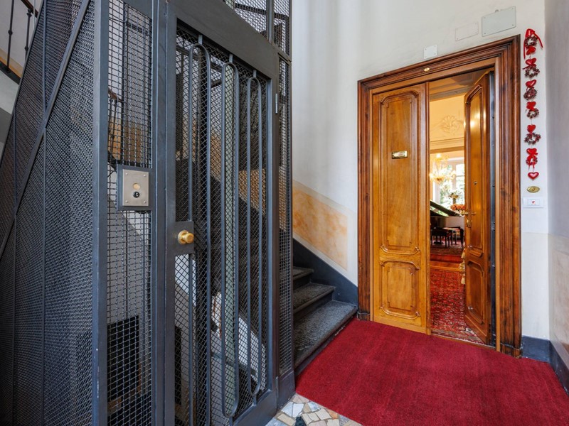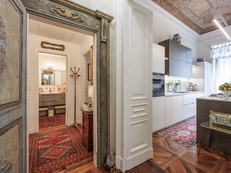 L'immobile è composto da ingresso, salone doppio con due camini, sala da pranzo, cucina abitabile con soffitto affrescato, tre camere da letto di cui quella padronale con bagno en suite e cabina armadio, un bagno e lavanderia. Attraverso la cucina si accede ad uno splendido grande terrazzo, interno cortile, esposto a est. L'unità immobiliare è ricca di particolari e decorazioni d'epoca, parquet originale nel salone e nelle camere, predisposizione per l'aria condizionata e infissi con doppio vetro camera. Possibilità di subentrare alla locazione di un box doppio e completa la proprietà una cantina di pertinenza.