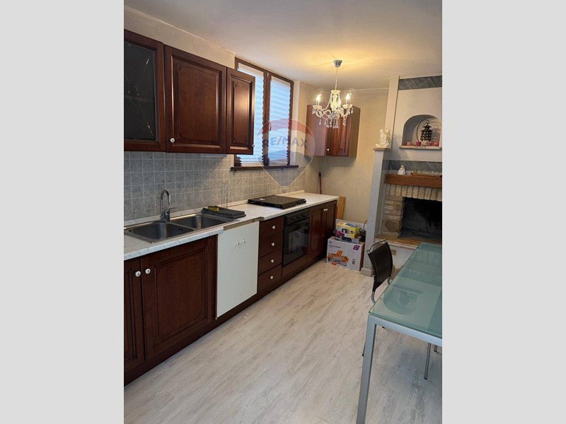 Zona giorno con angolo cottura ,camino a legna e divano.