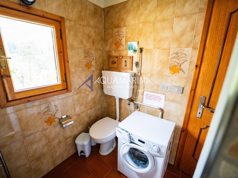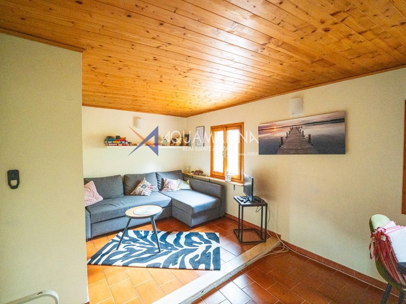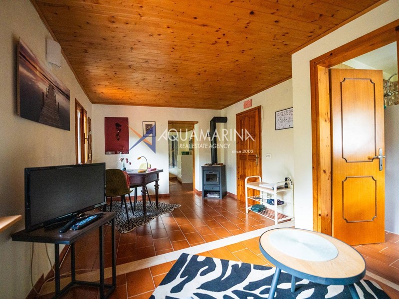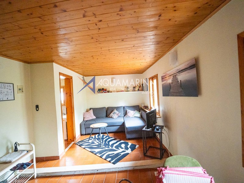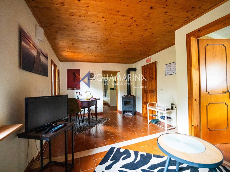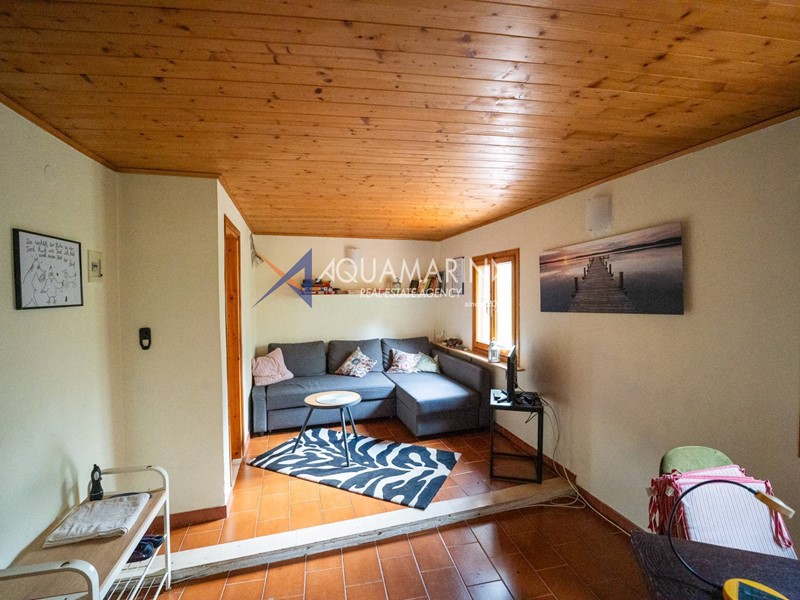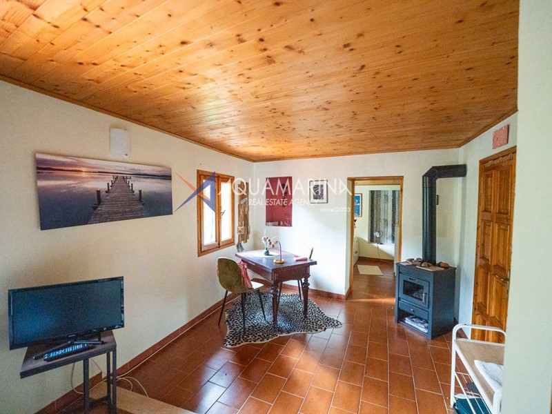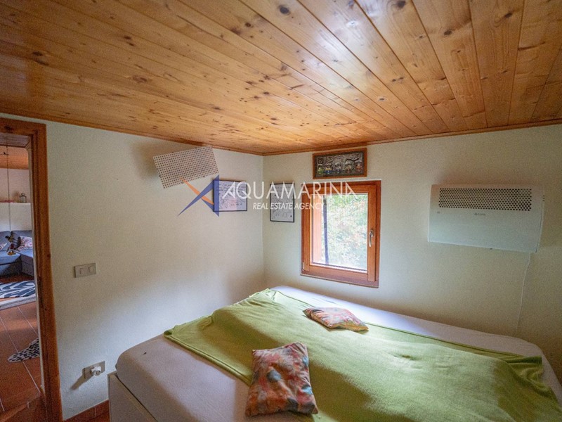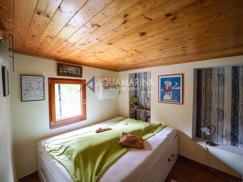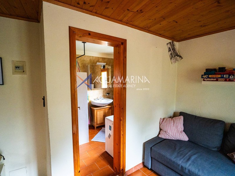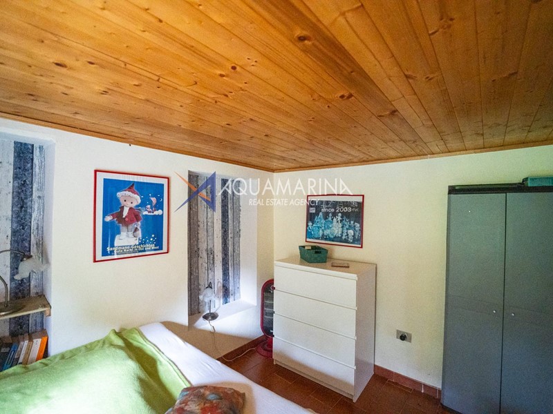 Il piano superiore ospita una camera matrimoniale, un soggiornino con divano, tv satellitare e stufa a legna, ed un bagno con doccia e lavatrice.