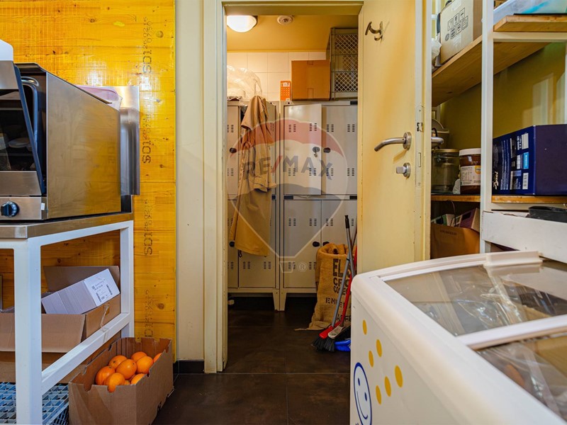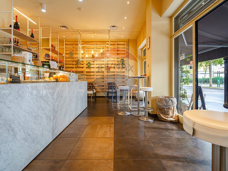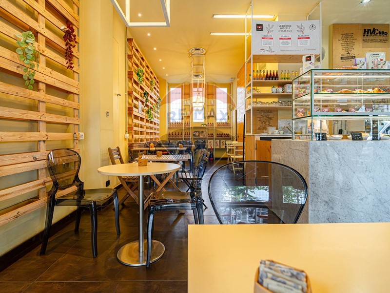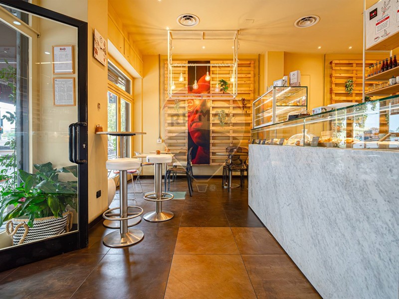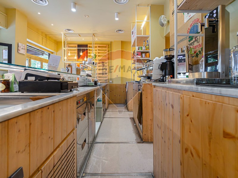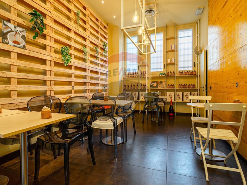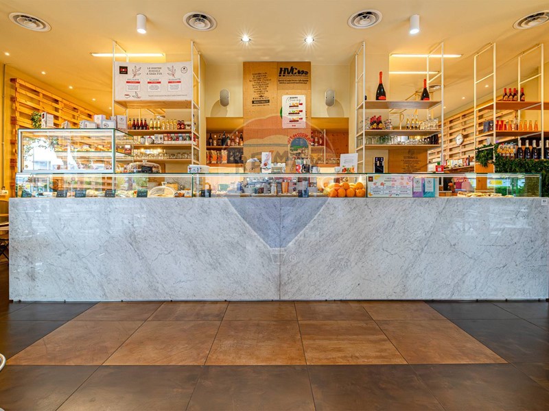 Gli spazi interni sono così composti: ingresso, ampio locale unico con bancone posizionato al centro e zona tavoli con 45 posti, spazio adibito a laboratorio ovvero zona preparazione, antibagno con lavandino, bagno disabili, spogliatoio finestrato, secondo bagno e due cantine al piano S1.
