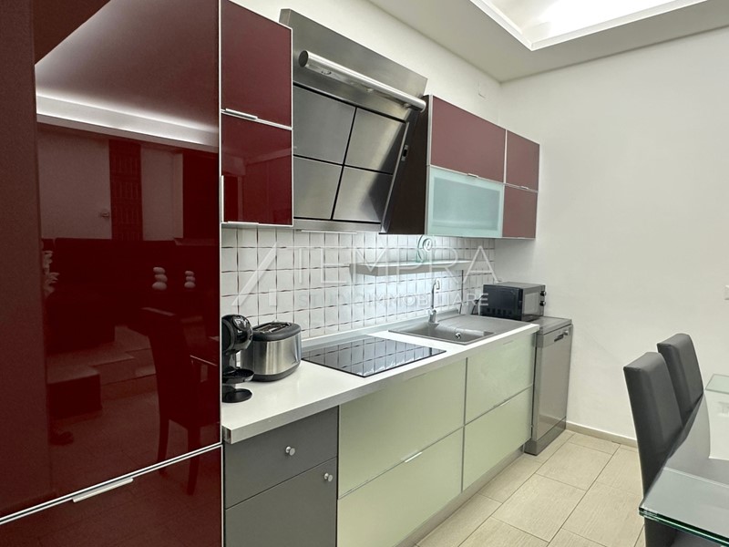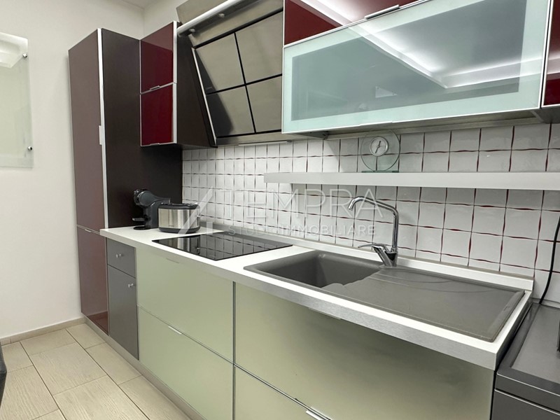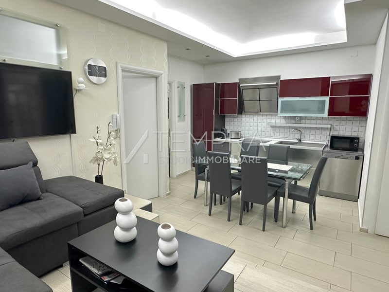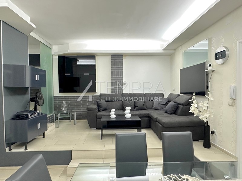 • Zona giorno open space con soggiorno e cucina a vista, arricchita da un elegante cucinino separato con porta in vetro scorrevole;