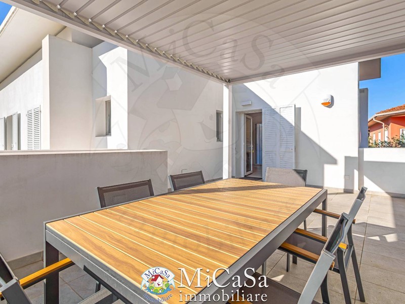 Lappartamento si raggiunge tramite lampia terrazza abitabile di 35 mq, attrezzata con struttura ombreggiante a lamelle regolabili, ideale per vivere gli spazi esterni in ogni stagione.