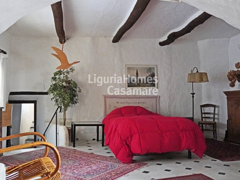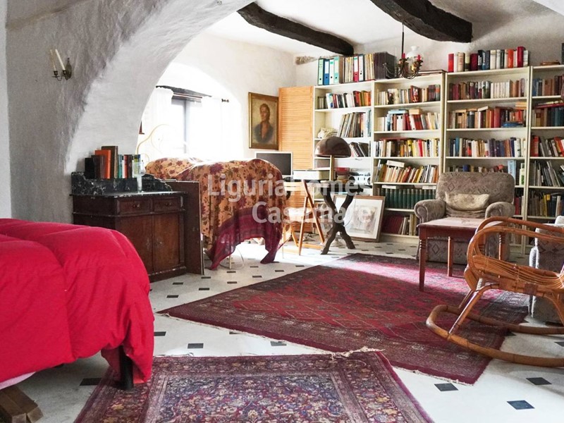 Lingresso della casa in vendita ad Imperia conduce a un accogliente salone caratterizzato da soffitti a volta e dettagli in pietra che richiamano il fascino autentico della tradizione ligure.