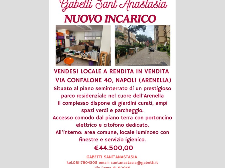 Locale a rendita, situato al piano seminterrato di un prestigioso parco residenziale nel cuore di Napoli, zona Arenella, una delle aree più richieste e in continua crescita. Il complesso offre ampi spazi verdi, giardini curati e un comodo servizio parcheggio.