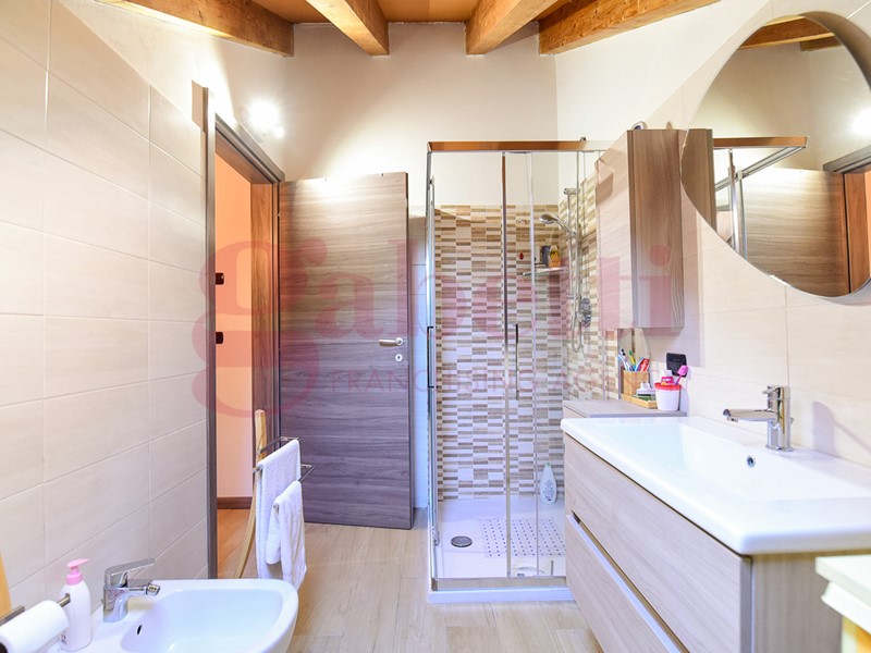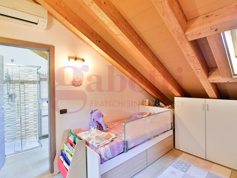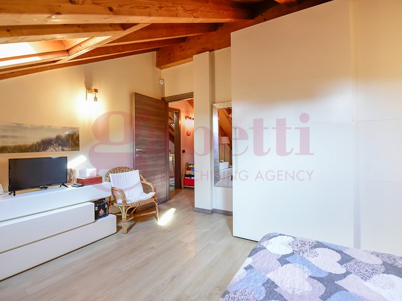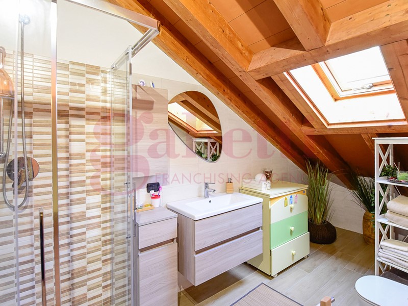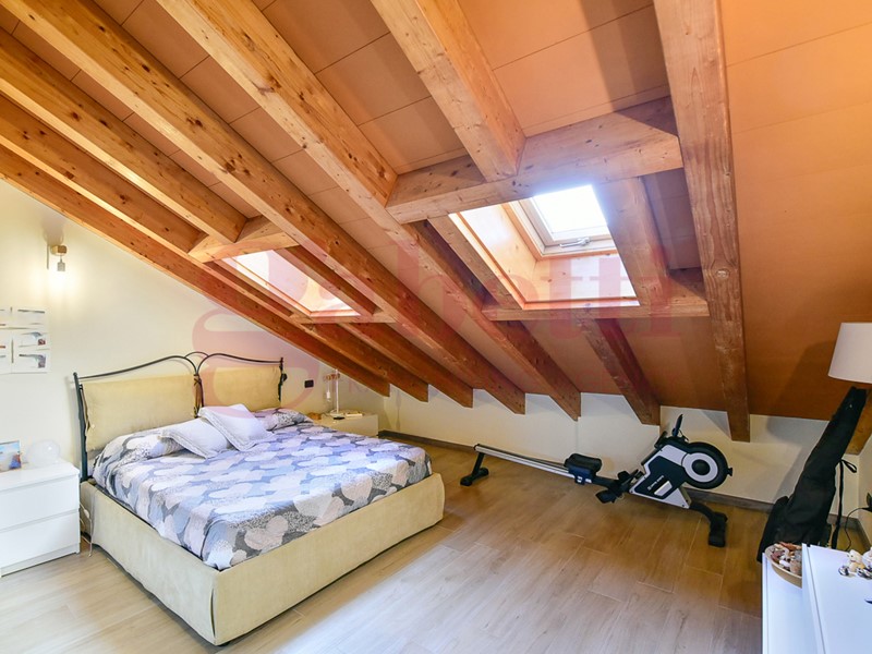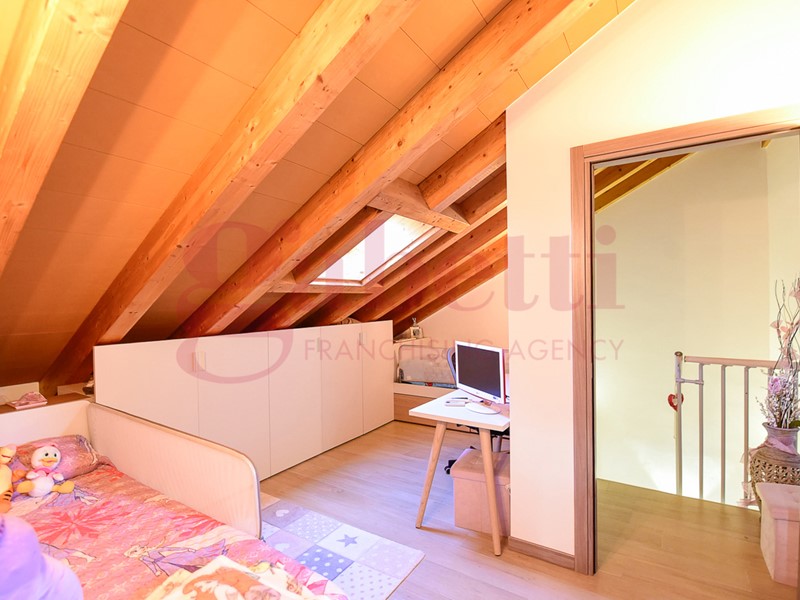 L'immobile è composto da ingresso su ampio e luminoso soggiorno con cucina semi-abitabile ed affaccio su terrazzo di 15 mq (esposizione sud-ovest), disimpegno che conduce alle due camere da letto ed al bagno completo di vasca. Tramite una comoda scala si accede al piano superiore rifinito con travi in legno dove troviamo una spaziosa camera matrimoniale, illuminata da due aperture velux, il secondo bagno provvisto di box doccia e un terzo ambiente utilizzato ad oggi come cameretta.