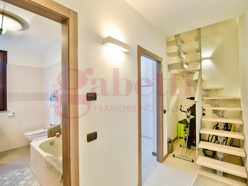 La soluzione dispone di riscaldamento centralizzato A PAVIMENTO con contabilizzazione autonoma con due termostati (uno per ogni piano) per regolare la temperatura. Come pavimentazione dispone di grès porcellanato al piano primo, al piano secondo grès porcellanato effetto legno. Serramenti in legno doppio vetro con persiane, aria condizionata, antifurto e videocitofono.