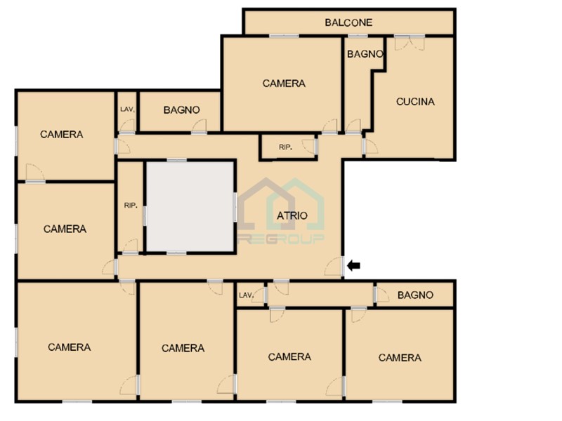 Distribuzione attuale: Sette ampie camere matrimoniali, tre bagni, due lavanderie, due ripostigli, cucina e balcone .