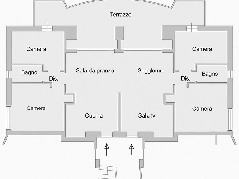 Attualmente suddiviso in due trilocali speculari e indipendenti di circa 70 mq ciascuno, ognuno con soggiorno e cucina a vista, camera matrimoniale, seconda camera, bagno e terrazzo vivibile.