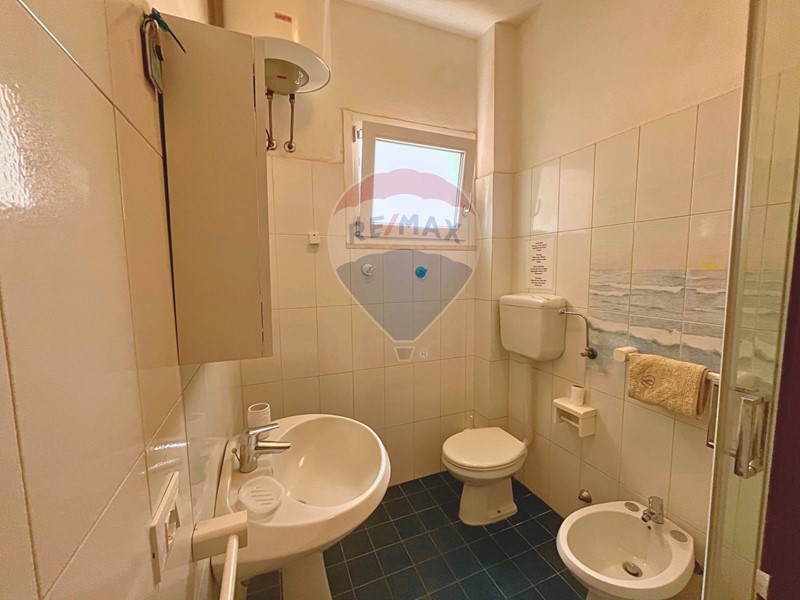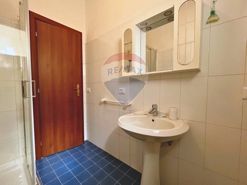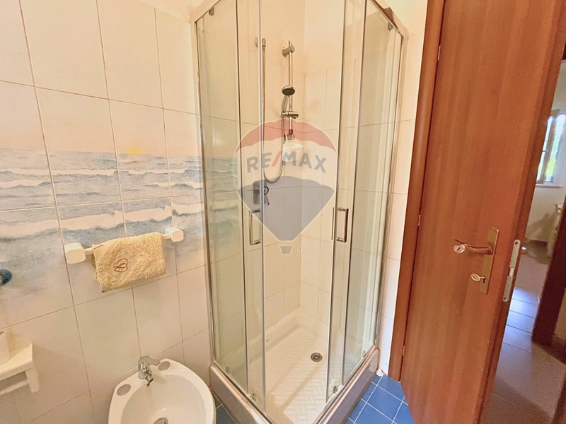 Un BAGNO FINESTRATO, caratterizzato da un design unico: piastrelle blu mare sul pavimento e bianche sulle pareti, arricchite da un DECORO ARTIGIANALE che raffigura un TRAMONTO SUL MARE con le onde. La doccia è ampia, e lacqua calda è garantita da un BOILER ELETTRICO.