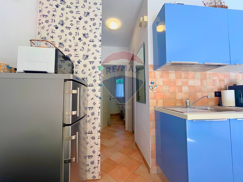 Entrando in casa si viene accolti da unatmosfera calda e ben curata: la zona giorno, compatta ma funzionale, ospita un angolo cottura completo di lavatrice, tavolo da pranzo, divano letto e pavimento in cotto dai toni rosso chiaro. Gli arredi, in bianco e azzurro indaco, donano carattere e freschezza allambiente, ben illuminato naturalmente soprattutto nel pomeriggio.
