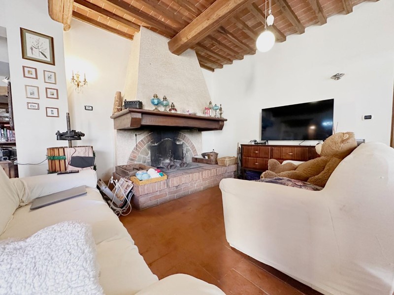 Piano terra: ampia cucina in muratura con cucina economica in perfetto stile toscano, spazioso soggiorno con grande camino a fiamma rovesciata, collegato all’impianto di riscaldamento a pavimento, che assicura calore uniforme e massimo comfort in ogni stagione.