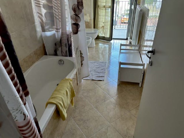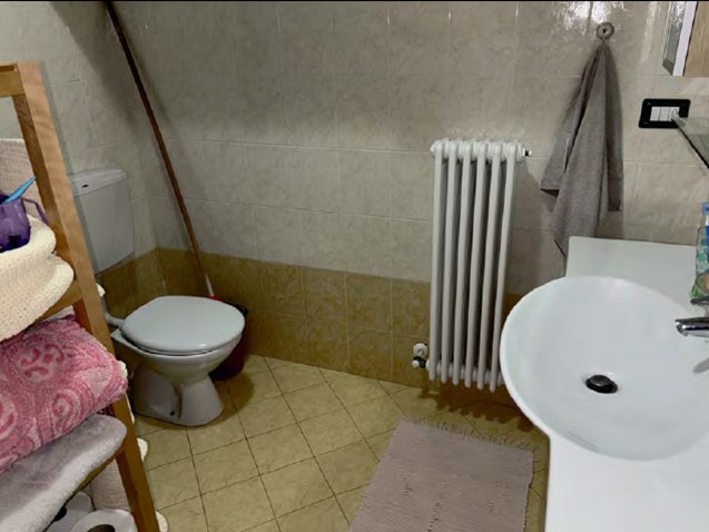 - con accesso dalla scala “H”, al piano primo (2° f.t.), alloggio, composto di ingresso su soggiorno-cucina, disimpegno, due camere, doppi servizi e ripostiglio;