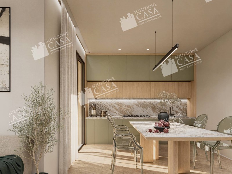 Al piano terra si apre un ampio soggiorno open space con cucina a vista, impreziosito da grandi vetrate che garantiscono luminosità naturale e continuità tra interno ed esterno.