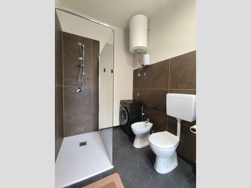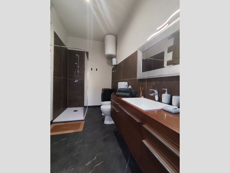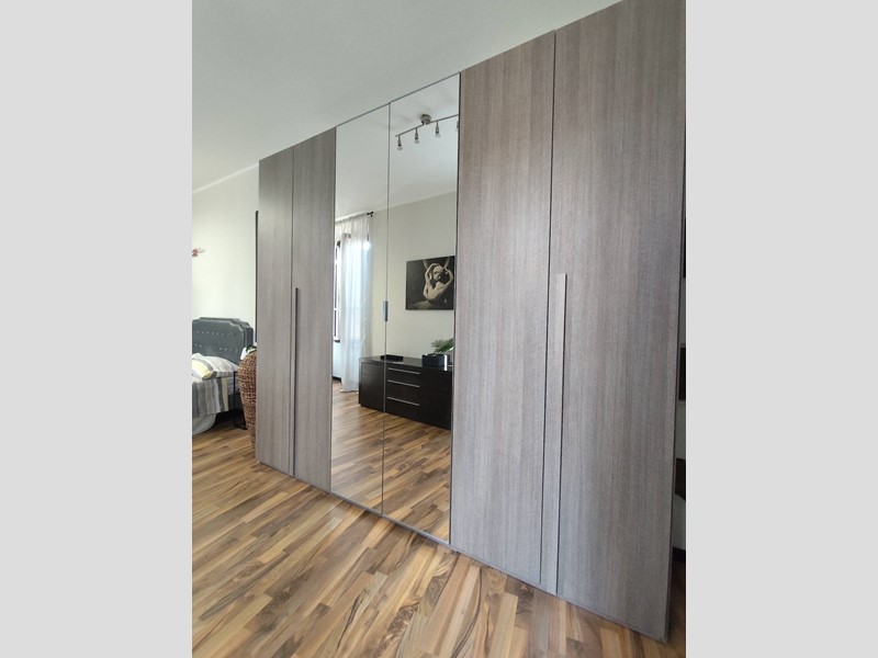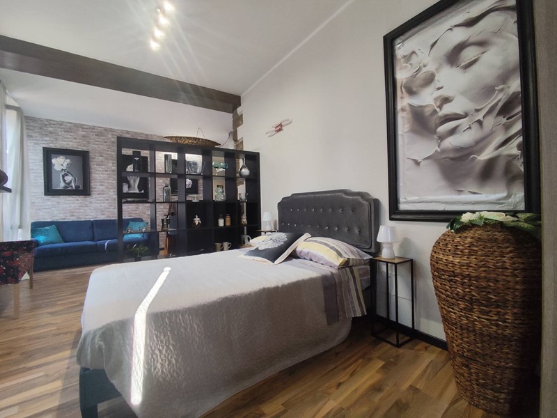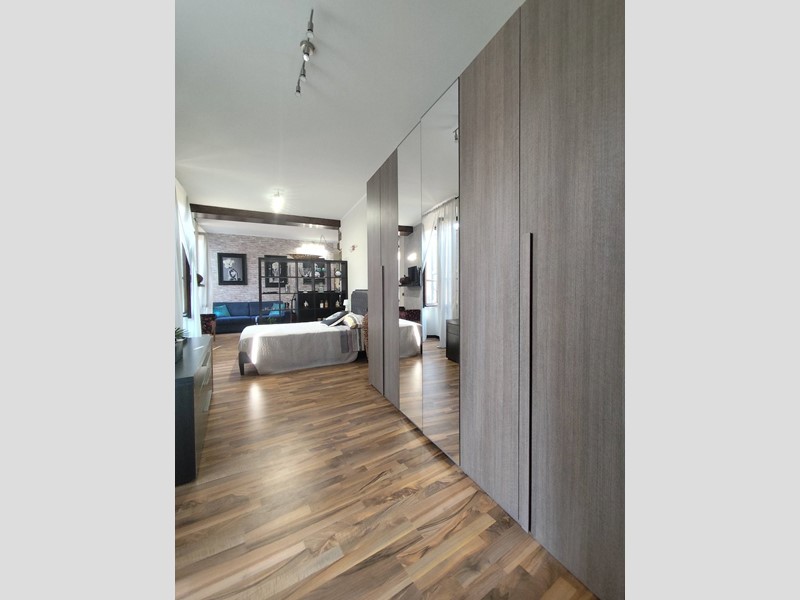 La zona notte, elegantemente organizzata, ospita un letto matrimoniale con armadiature su misura e si completa con un bagno finestrato, dotato di porta-finestra con accesso diretto al balcone, doccia e lavatrice.