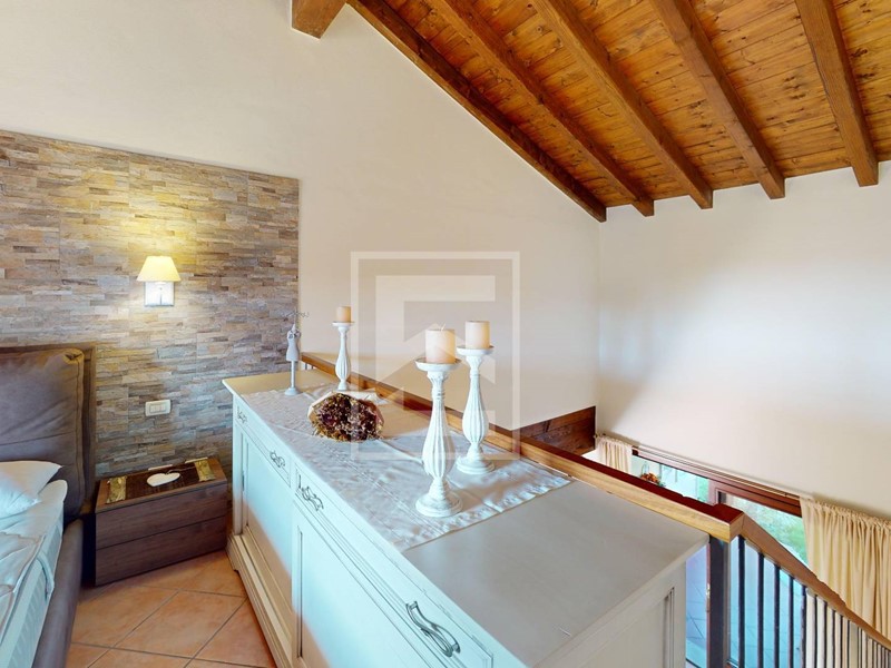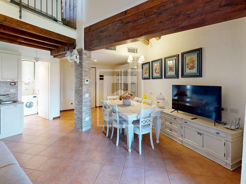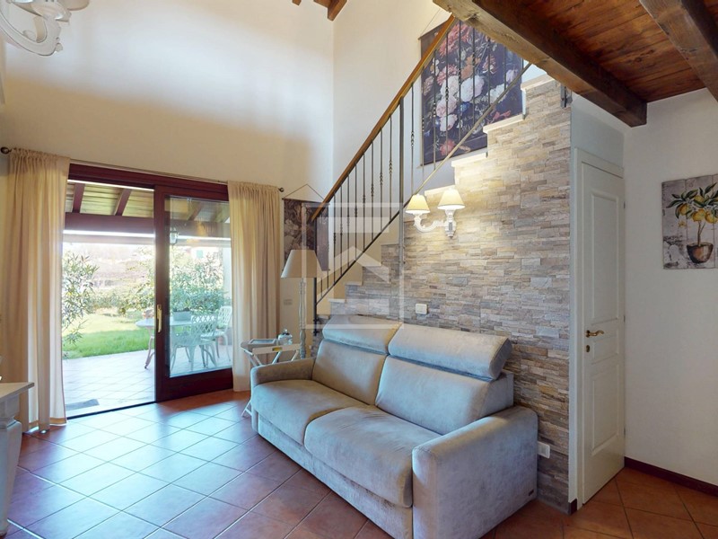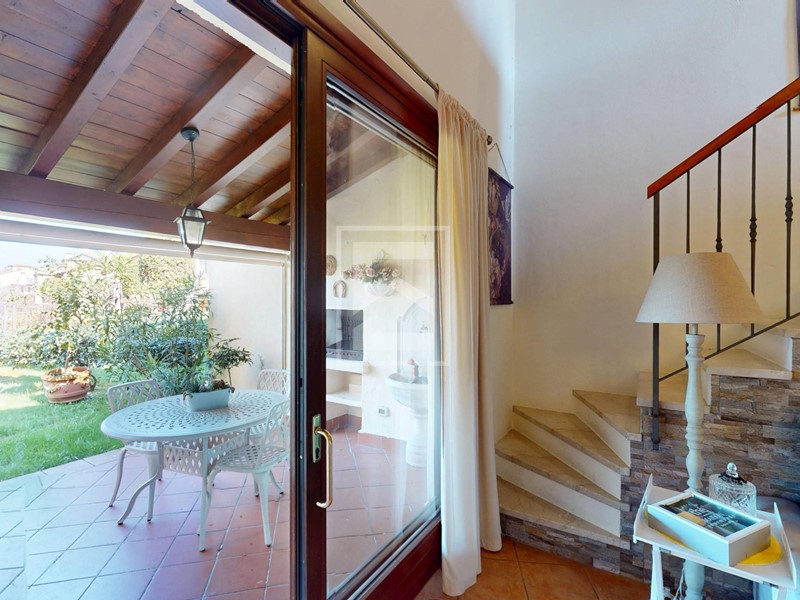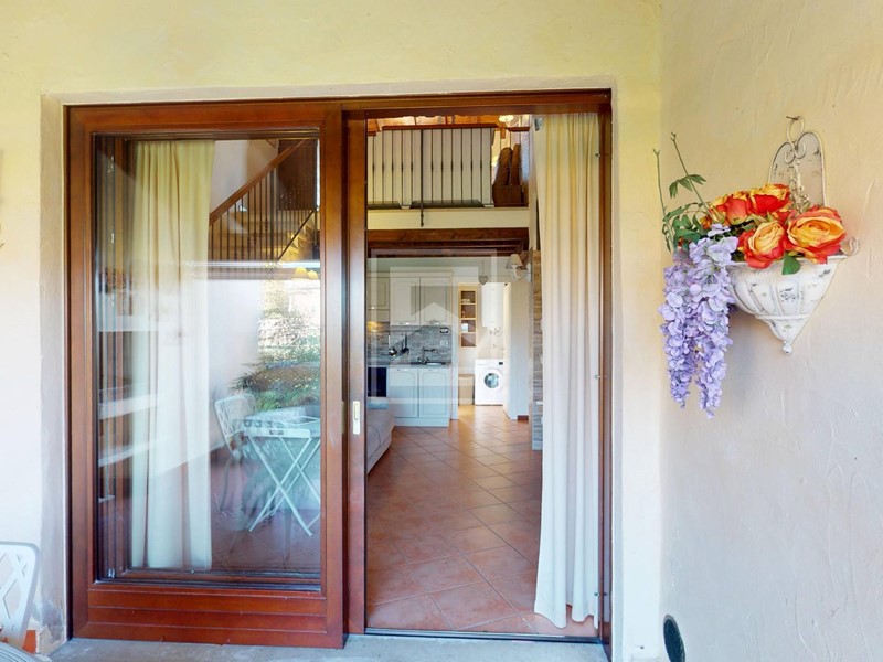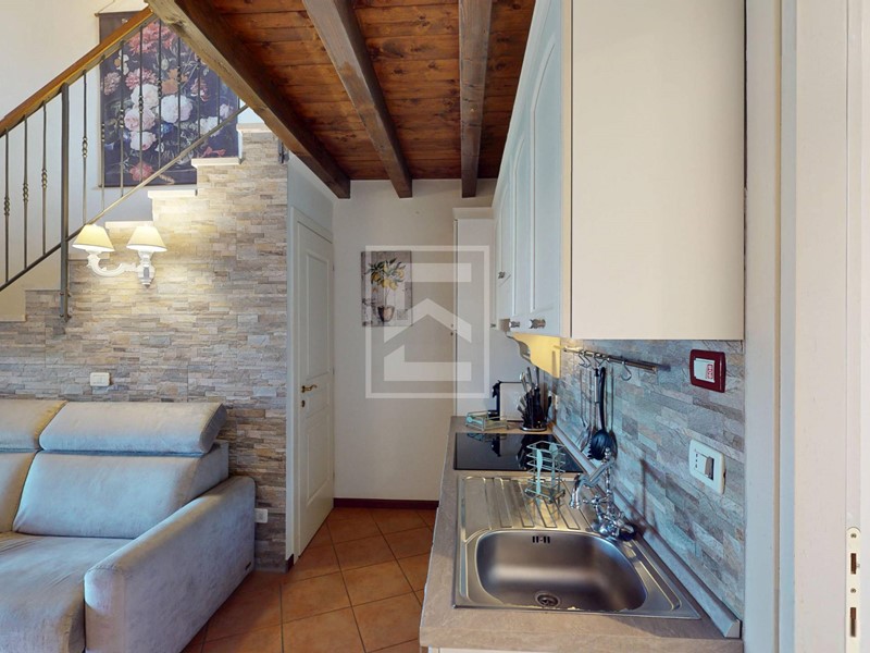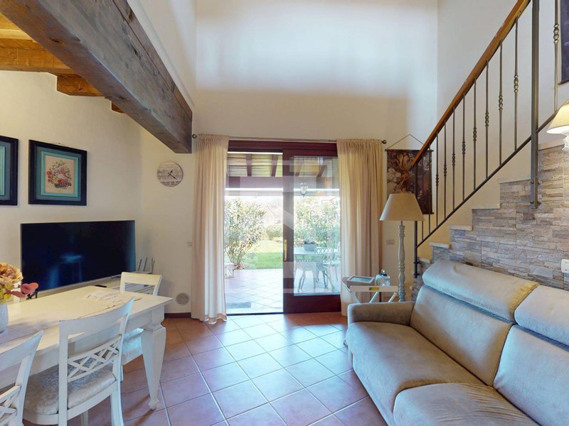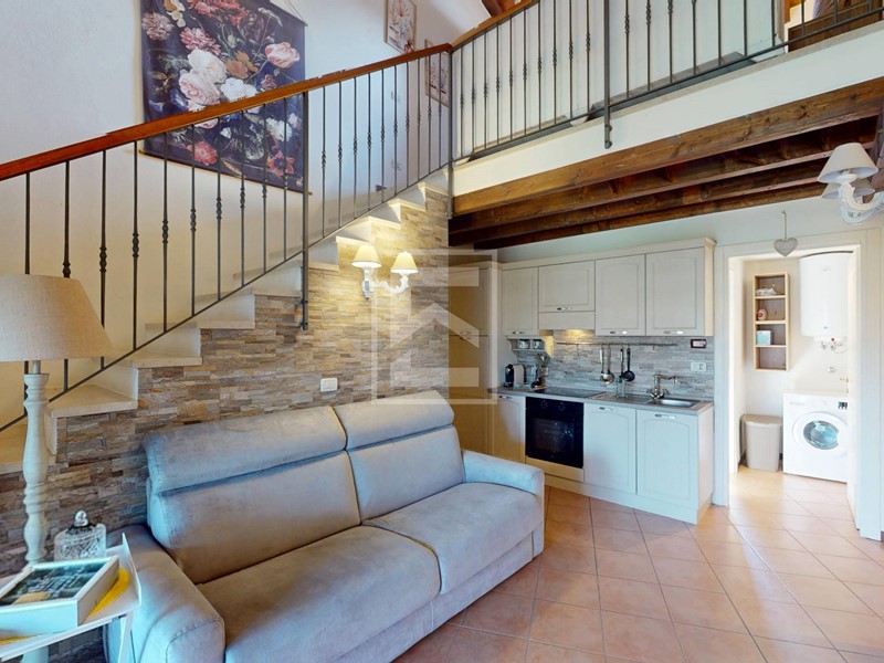 All'appartamento si accede tramite entrata privata che comunica con il giardino retro. La zona living è molto ampia, dalla porta finestra si accede al portico con giardino fronte privato. Il portico è attrezzato con barbecue, fontanella e tende di copertura; ideale per pranzare all'aperto e godersi la bella stagione. La cucina è a vista con ripostiglio sottoscala. Dalla zona giorno si passa tramite disimpegno anti bagno ,con comodo angolo lavanderia, al bagno finestrato con doccia. Sempre dalla zona giorno, si sale tramite una scala in muratura al caratteristico soppalco con la zona notte. Le travi a vista, le cornici e l'arredo rendono l'appartamento molto accogliente e di buon stile.