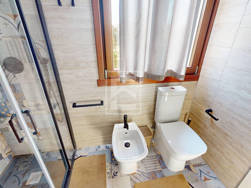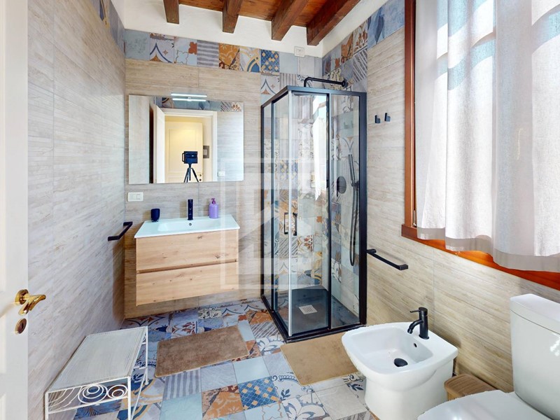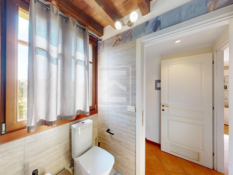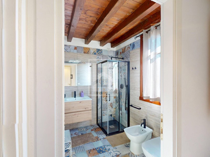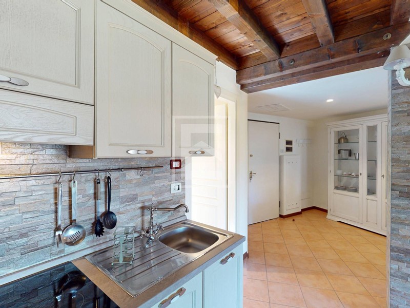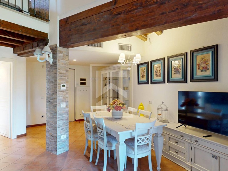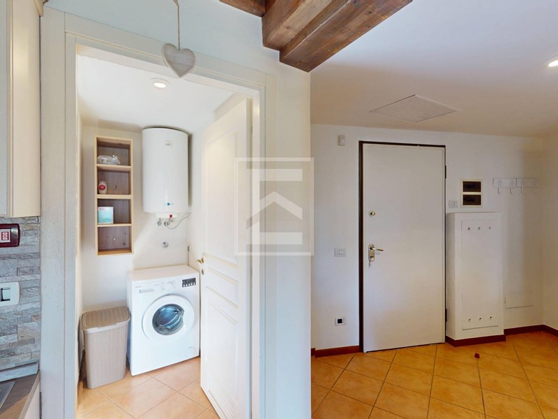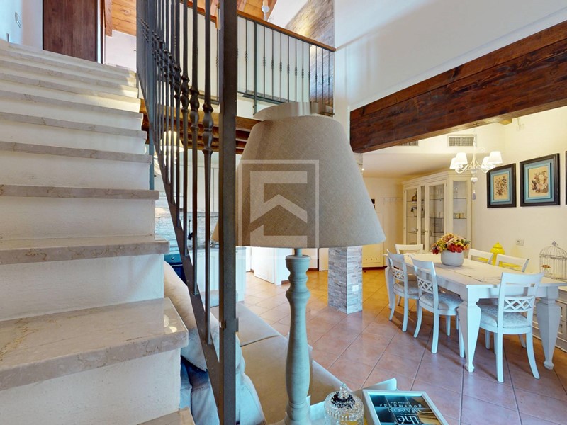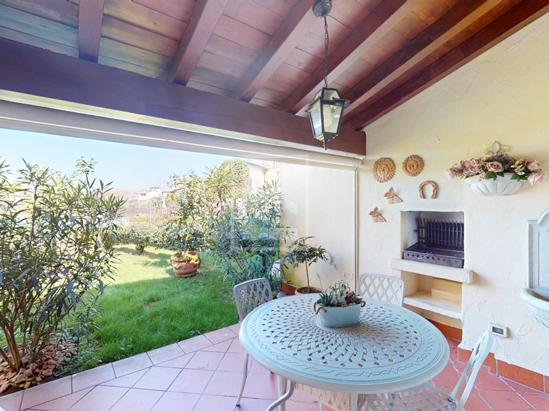 All'appartamento si accede tramite entrata privata che comunica con il giardino retro. La zona living è molto ampia, dalla porta finestra si accede al portico con giardino fronte privato. Il portico è attrezzato con barbecue, fontanella e tende di copertura; ideale per pranzare all'aperto e godersi la bella stagione. La cucina è a vista con ripostiglio sottoscala. Dalla zona giorno si passa tramite disimpegno anti bagno ,con comodo angolo lavanderia, al bagno finestrato con doccia. Sempre dalla zona giorno, si sale tramite una scala in muratura al caratteristico soppalco con la zona notte. Le travi a vista, le cornici e l'arredo rendono l'appartamento molto accogliente e di buon stile.