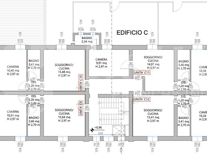 APP TRILOCALE C11: Situato al piano secondo ingresso su soggiorno con angolo cottura, due camere da letto e due bagni.