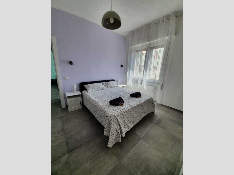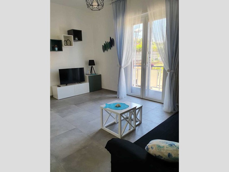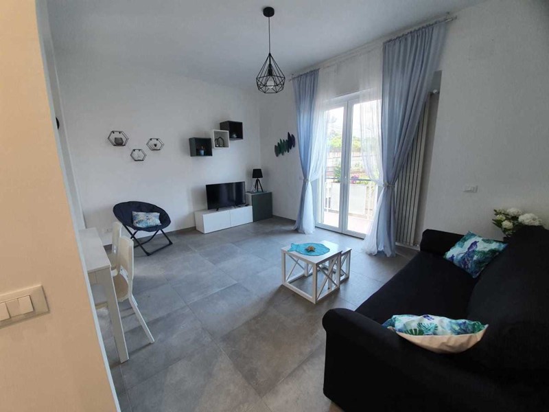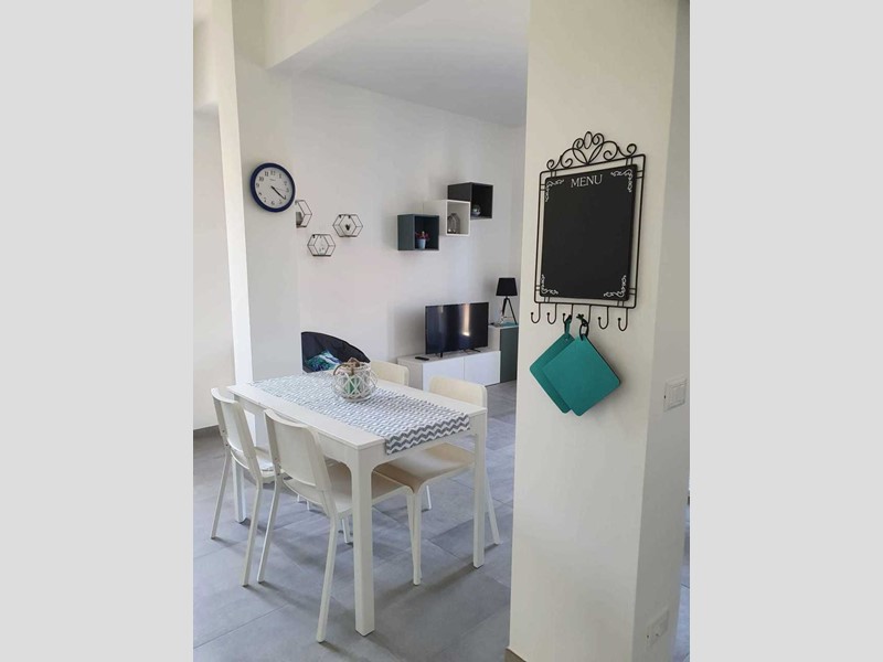 L’alloggio è composto da ingresso, grande e luminoso soggiorno con cucina a vista, balconata con vista mare laterale, camera matrimoniale, seconda camera con due letti singoli, bagno finestrato con box doccia e pratico ripostiglio. Completano la proprietà una cantina e un posto auto scoperto privato.