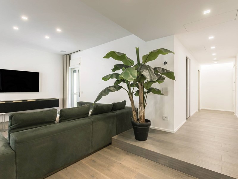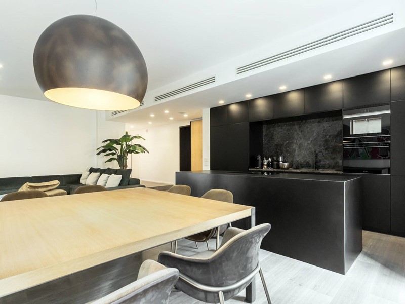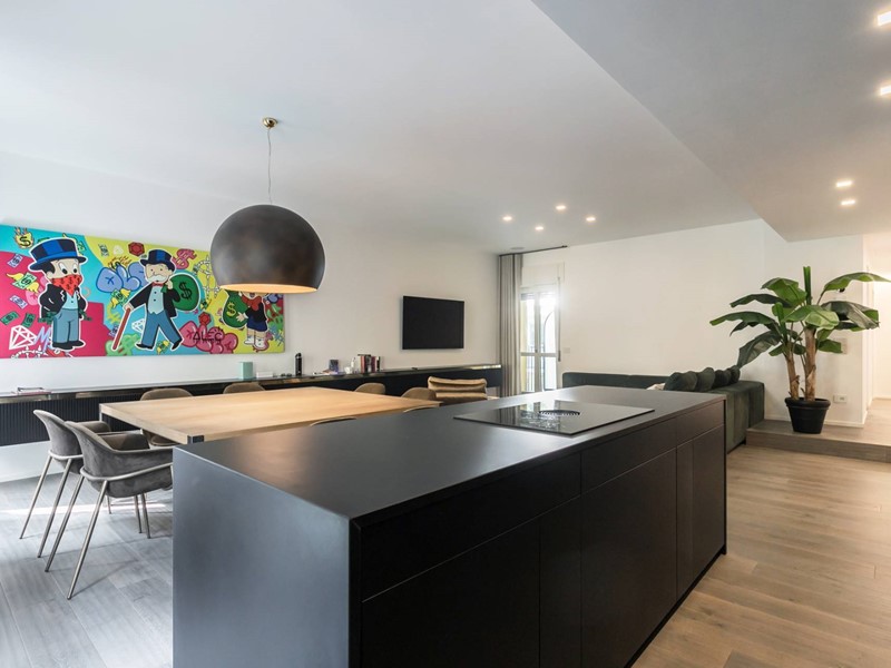 La zona living, ampia e luminosa, accoglie un raffinato soggiorno con cucina a isola in finitura nera opaca con piano in Laminam resistente al taglio, completa di elettrodomestici Miele.