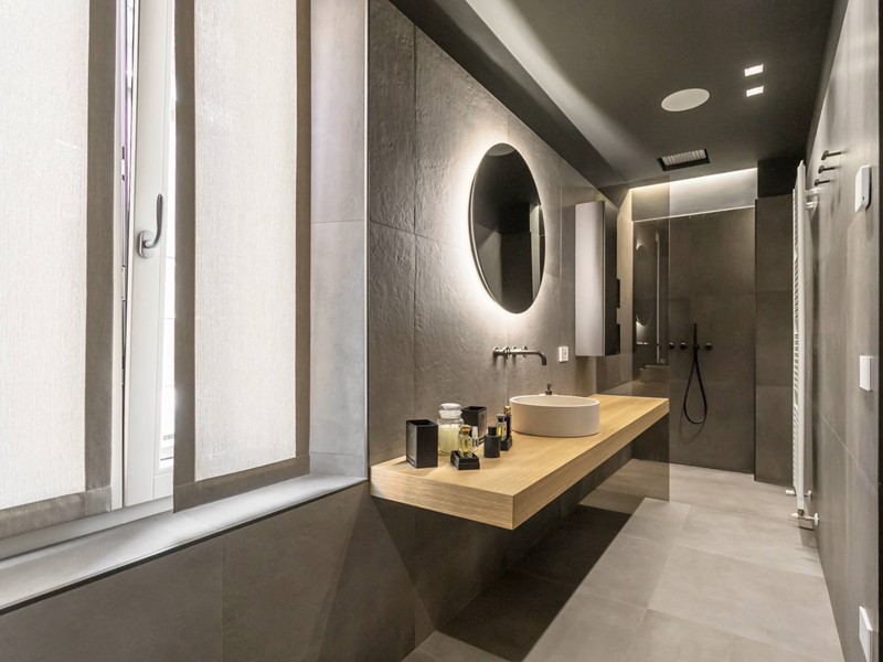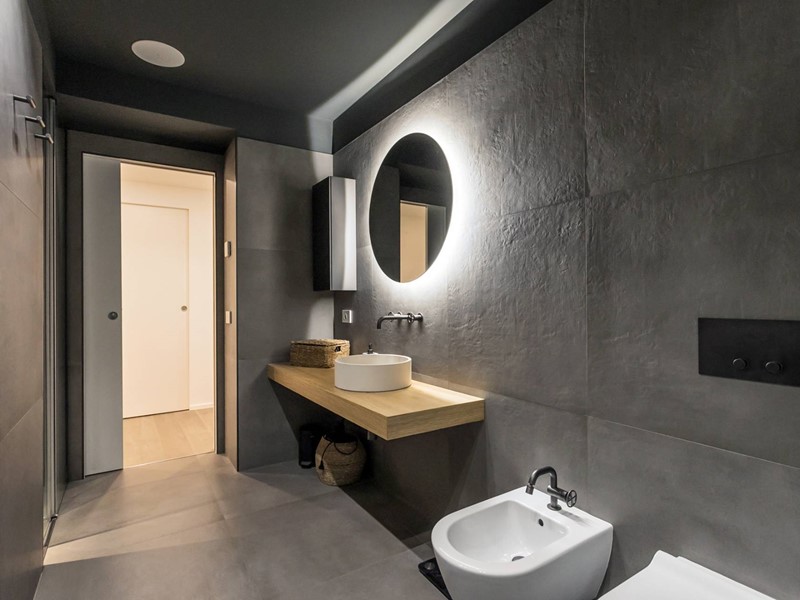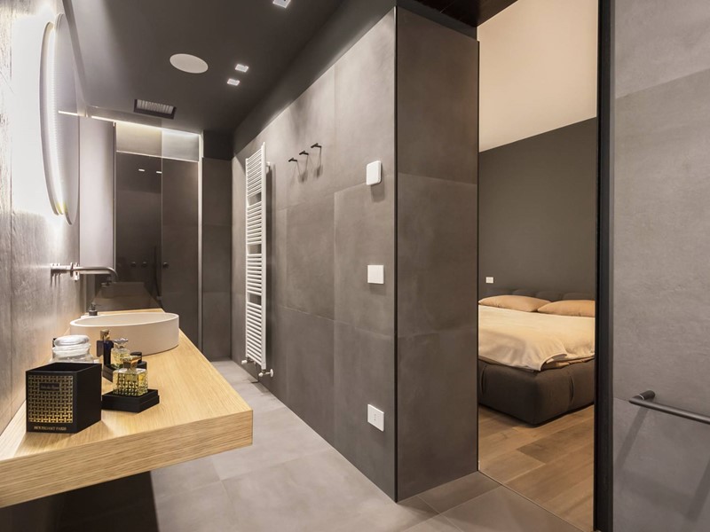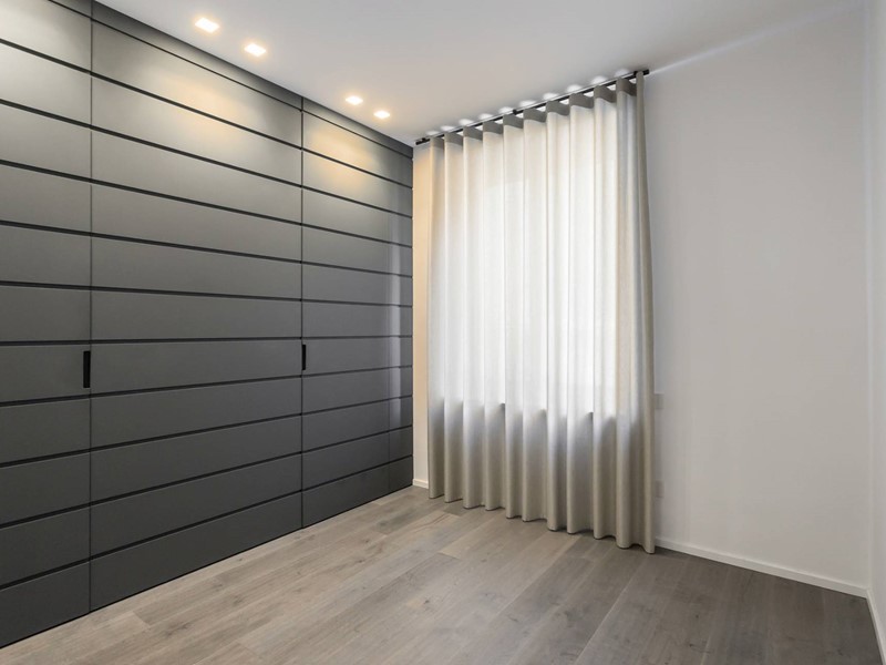 La zona notte comprende una camera padronale con letto Tufty Bed di B&B Italia, unampia cabina armadio su misura, seconda camera e due bagni con piastrelle Marazzi 80x80, lavabi in pietra avorio e rubinetteria Fontane Bianche.