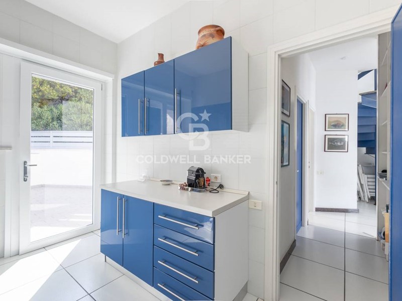 La villa si sviluppa su spazi generosi e ben distribuiti. Al piano terra troviamo un ampio soggiorno con camino che si apre su un terrazzo fronte mare, perfetto per rilassarsi allaperto in totale privacy. Completa la zona giorno una cucina abitabile completamente attrezzata, anchessa con accesso diretto a un secondo terrazzino esterno, uno studiolo e un bagno con doccia.