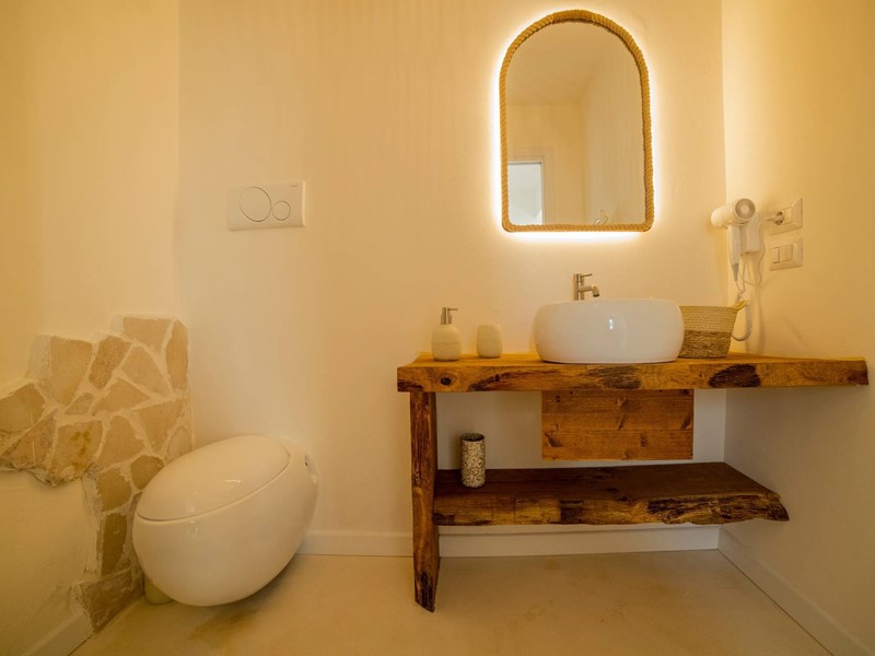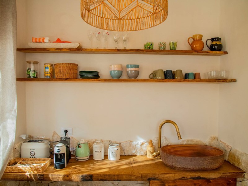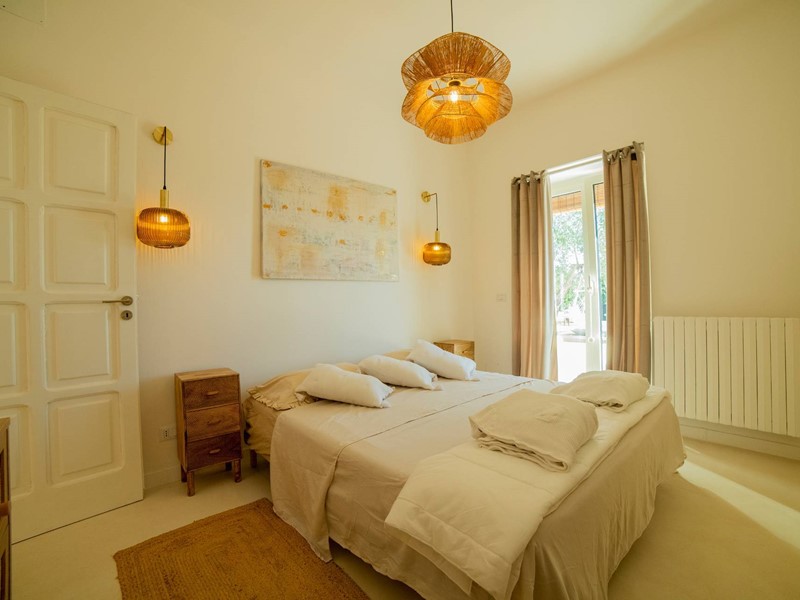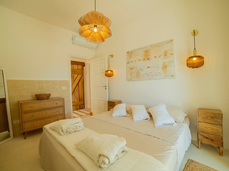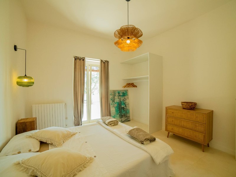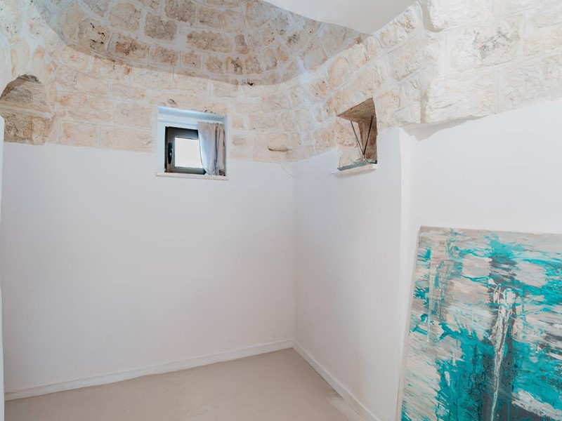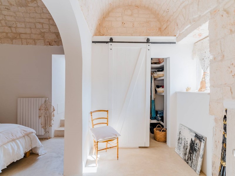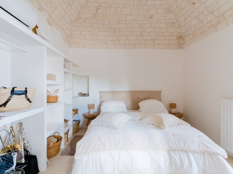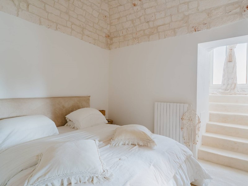 Dal corridoio si accede alla zona notte composta da due camere matrimoniali con accesso autonomo sulla piscina, una terza camera da letto e un comodo bagno. La scelta tecnica ed estetica, per valorizzare questi antichissimi trulli, è stata quella di utilizzare solo materiali naturali, come la pietra, la calce, rendendo gli ambienti molto accoglienti e di grande suggestione!